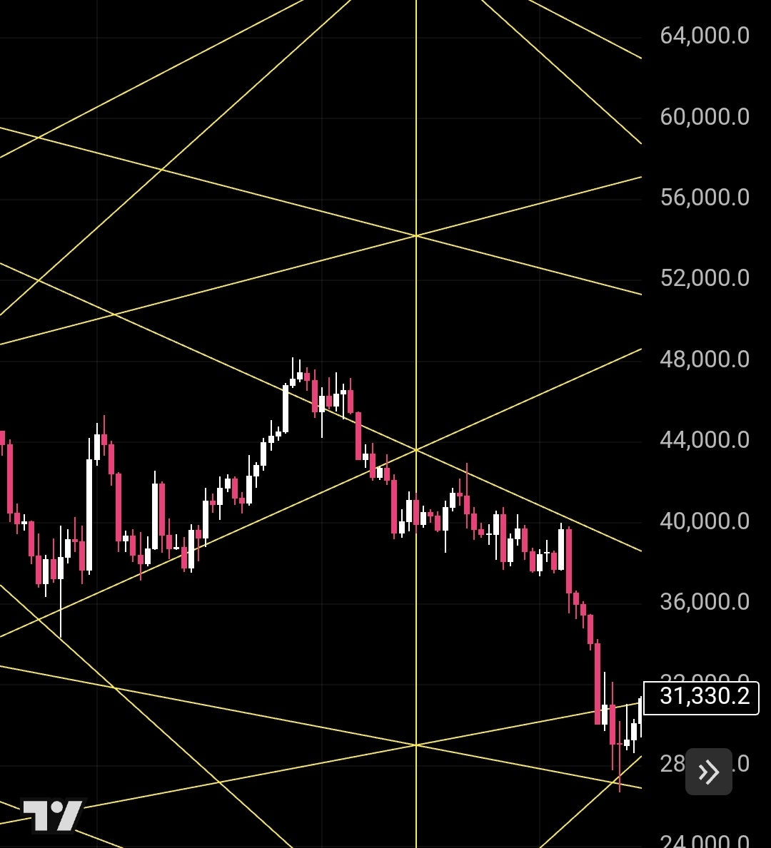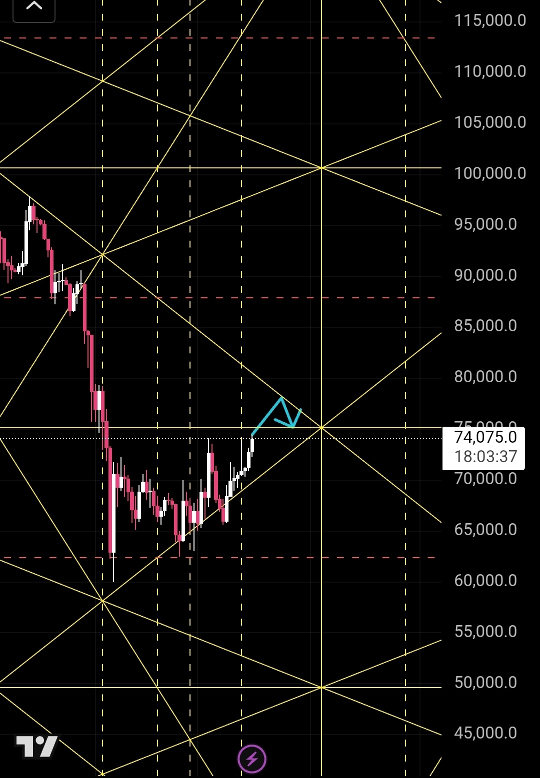 2/ لما شفت إللي حصل في الموسم السابق حصل انه اخترق خط المنتصف وبعد كده طلع عمل اختراق كاذب لترند ال 1:1 إللي جاي من فوق طيب المفروض إللي يحصل مع السيناريو ده أنه يكمل صعود حتى يوم 24 مارس عند سعر ما بين 79_82 الف وبعد كده يكمل هبوط قبل 4 ابريل منطقة انعكاس قويه عشان نكمل دورى دورة الهبوط