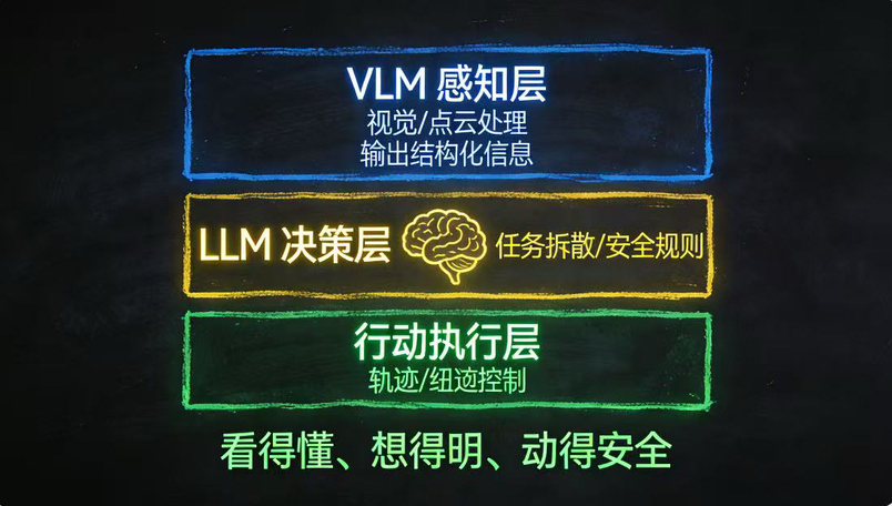 第一层是VLM视觉语言模型,负责统一处理机器人所有的外部感知信息,包括摄像头画面、点云数据、力扭矩反馈、激光雷达信号等,最终输出结构化、可阅读、可检查的环境描述。这一步让机器人看到的内容不再是模糊的网络特征,而是明确、可追溯的信息,从根源上解决了感知不可查的问题。