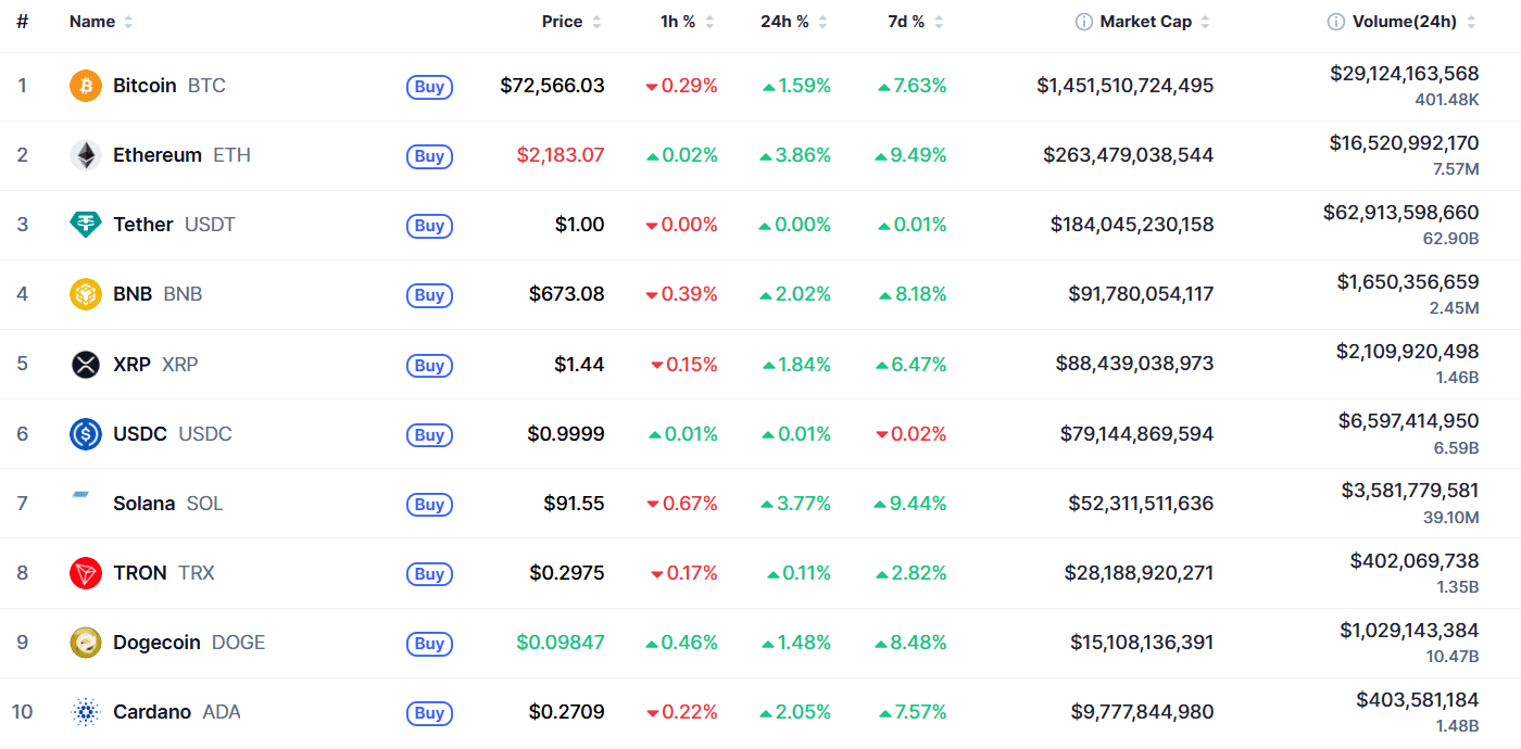 Биткоин (BTC), по данным ресурса TradingView, начал понедельник с бокового движения. По состоянию на 07:10 (МСК), криптовалюта торгуется по $72 571 (1 токен в рублях — ₽5 851 078). Минимум биткоина за 24 часа — $71 259, максимум — $73 173.