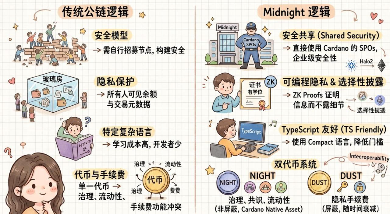 这也就是为什么我最近盯着 @MidnightNetwork 蹲了很久。翻了三遍白皮书后,我发现 Midnight 不只是在做一个隐私链,它更像是在给略显沉寂的 Cardano 生态注入一剂强心针。