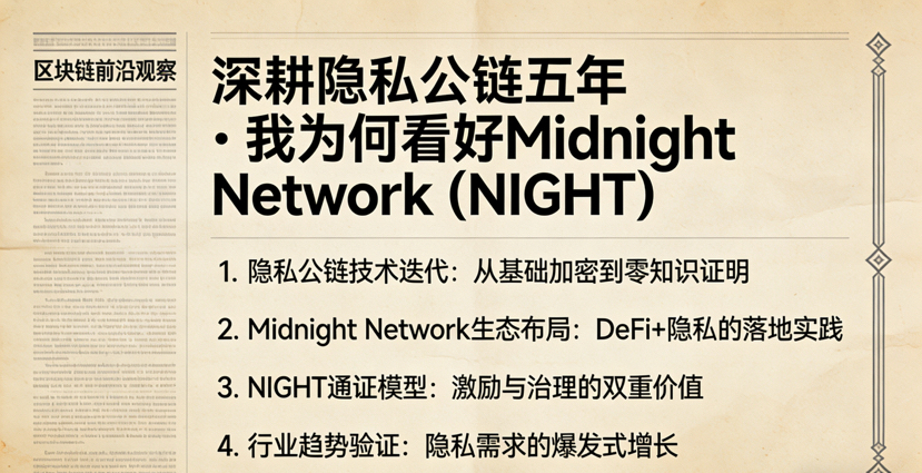 从2020年一头扎进区块链隐私赛道算起,我摸爬滚打了整整五年,踩过的坑、研究过的项目、耗进去的时间,数都数不清。从早期的门罗币、Zcash,到后来扎堆冒头的zk系隐私公链,我几乎把赛道里所有叫得上名的项目都复盘过、实测过,甚至泡在Discord和GitHub里跟开发者对线、看源码迭代。这五年里我见过太多打着“隐私革命”旗号的空气项目,也见证过无数技术华丽却死在合规和落地路上的明星链,直到2024年接触到Midnight Network,代币简称NIGHT,我才真正觉得,隐私赛道等来了那个能解决核心矛盾的务实玩家。今天这篇文章,没有AI式的套话、没有浮夸的营销话术,全是我这两年跟踪Midnight、实测测试网、拆解代币模型、调研生态落地的真实感悟,字数聊透,干货拉满,只给真正懂行、想做长期价值的同好看。
