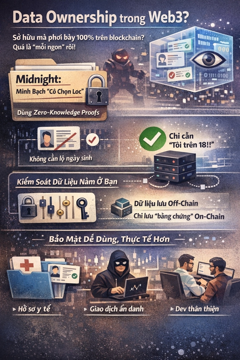 Nói thật nhé, cụm từ “Data Ownership” trong Web3 dạo này bị lạm dụng đến mức nghe phát ngán. Ai cũng rêu rao về việc “người dùng làm chủ dữ liệu”, nhưng nếu ngồi nghĩ kỹ một chút làm chủ kiểu gì khi mọi giao dịch, mọi số dư, mọi tương tác của ông đều phơi bày 100% trên blockchain cho cả thế giới soi mói?