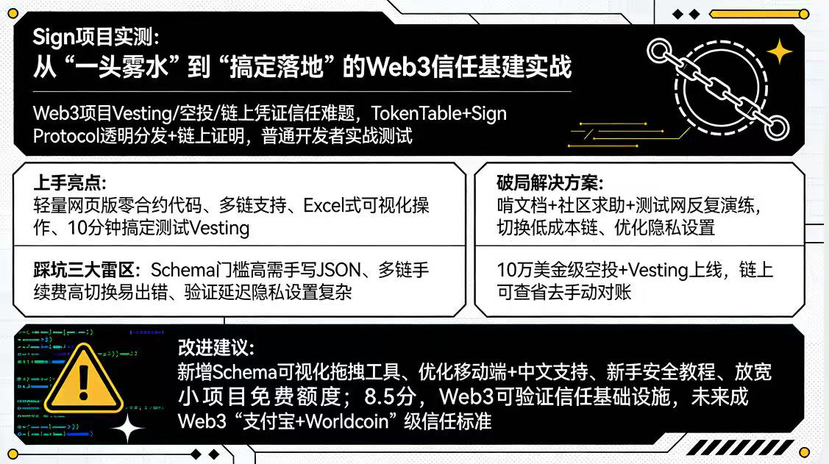 Moje ostateczne przemyślenie to: przyjaciele, którzy naprawdę chcą solidnie realizować projekty, powinni spróbować wersji lite TokenTable, zaczynając od małego vestingu. Nie bójcie się przeszkód, dokumentacja i społeczność naprawdę mogą pomóc wam się wydostać. Już umieściłem mój szablon schema na GitHubie, zapraszam do forku lub odniesienia się do niego. Sign przekształca blockchain z "zabawki" w prawdziwe narzędzie do cyfrowej suwerenności, a po moim doświadczeniu, zdecydowanie jestem optymistą co do tego.
