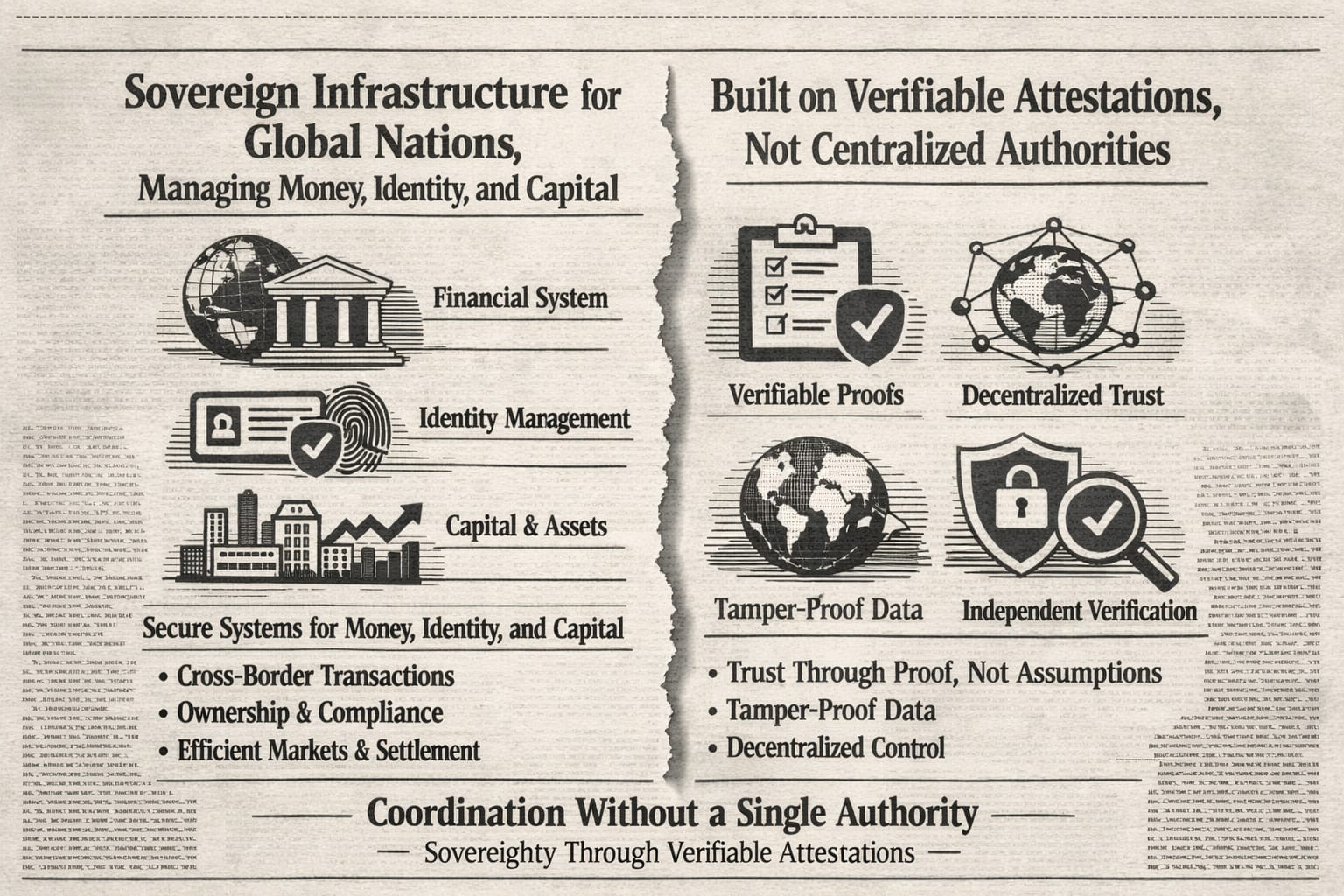 Sovereign infrastructure only matters if it can coordinate trust without depending on a single authority. That is the core problem both documents address. One side describes a world where nations need durable infrastructure for money, identity, and capital. The other side shows why that infrastructure must be built on verifiable attestations rather than assumptions, manual checks, or centralized approval.
