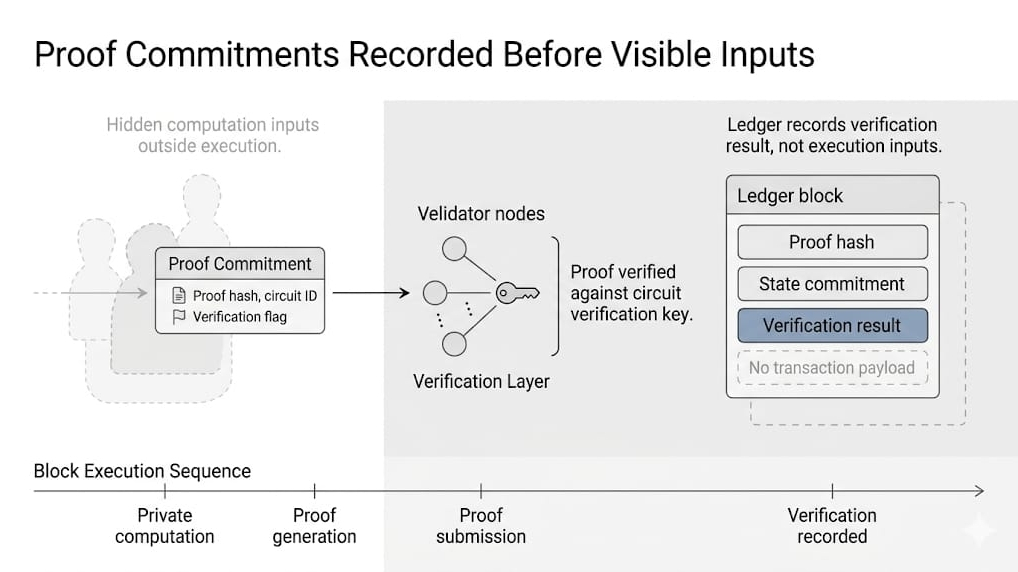 Walidatorzy widzą wynik tylko wtedy, gdy przychodzi ważny dowód. Sprawdzają dowód w odniesieniu do kluczy weryfikacyjnych kontraktu, potwierdzają, że zasady obwodu zostały przestrzegane i zakotwiczają wynik przez warstwę weryfikacji dowodu Midnight.
