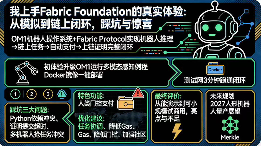 最后说说我的结论。从 2026 年 3 月的视角来看,我反复上手的感觉是:@Fabric Foundation 的野心和执行都在稳步往前推。OM1 已经不是单纯的玩具级框架,能跑闭环任务加链上结算了;协议层的基础支付和证明机制也基本可用,gas 和延迟都控制得还行。但离真正的“机器人经济”还有明显距离,真实硬件适配案例还是少,协作智能弱,中心化依赖点(像那个确认页面还有部分 RPC)还没完全去掉。一句话总结现阶段状态:技术上已经从“能演示”进化到“可小规模试商用”,但距离“基础设施级可靠”大概还有一到两年的工程打磨。