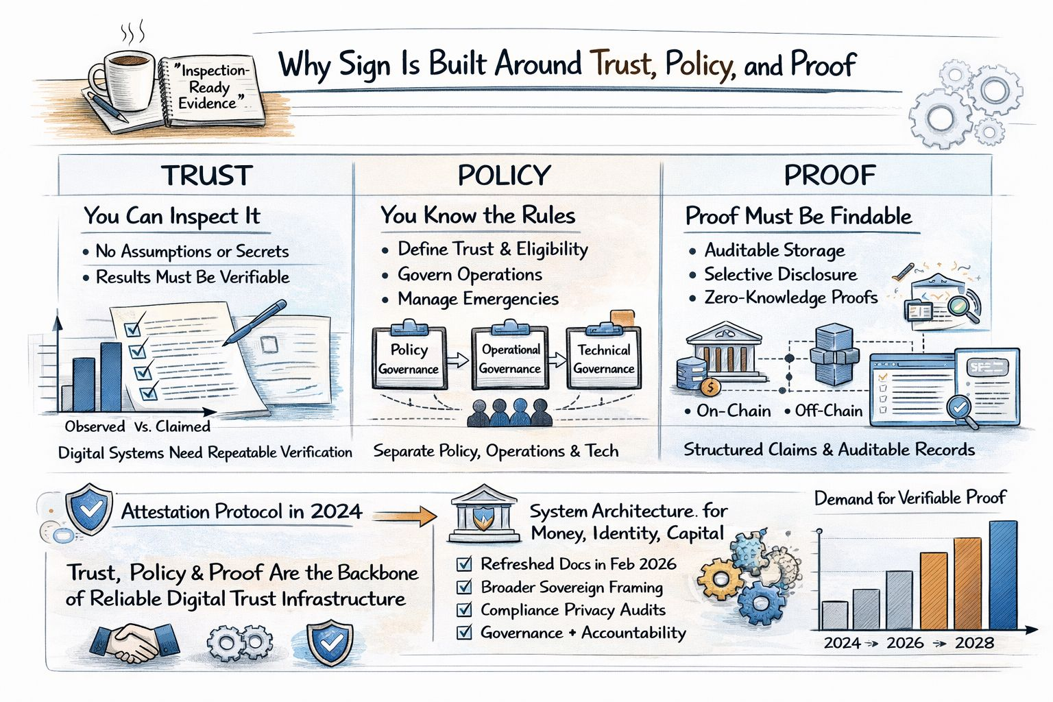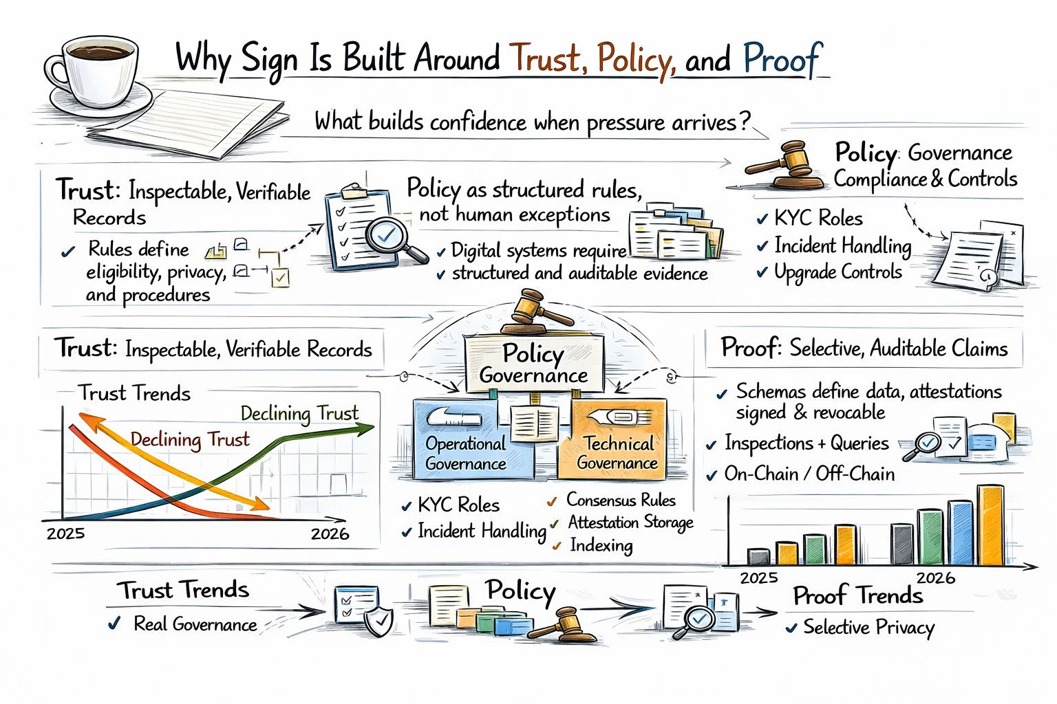 When I step back I do not see Sign mainly as a crypto brand trying to sound institutional. I see an attempt to build administrative memory for digital systems that have become too important to run on informal trust. That is why the combination of trust policy and proof feels coherent to me because trust tells me what must be believable while policy tells me who sets the rules and proof tells me what survives scrutiny. I do not think that solves every governance problem but it does make evasions harder and in a period when digital money credentials and public-facing systems are all getting more regulated and more connected that order seems less like branding and more like basic discipline.