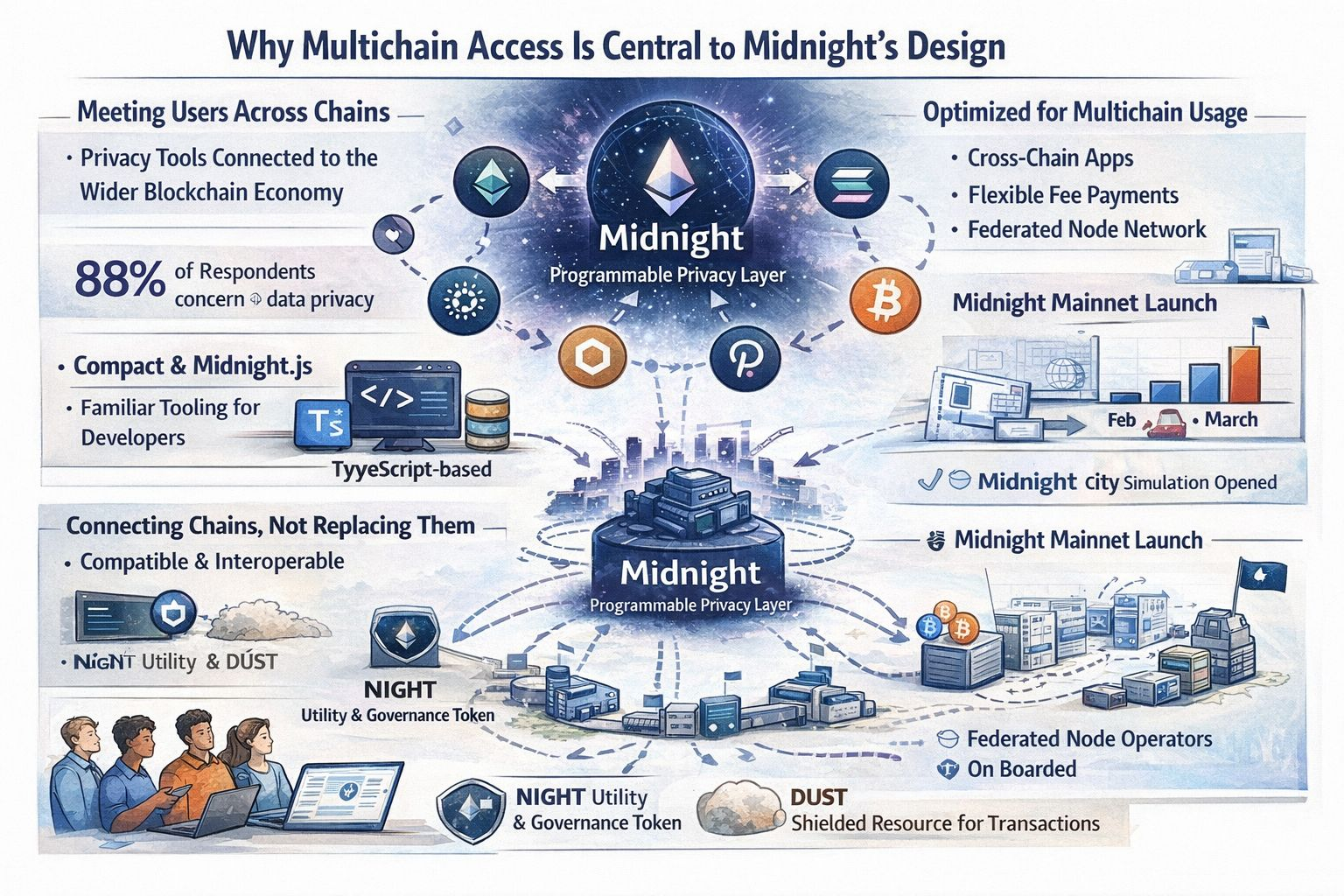 That is where multichain access stops looking like a feature list item and starts looking structural. Midnight’s own descriptions are direct about it. The team says the network is designed as a programmable privacy layer, not a closed privacy island. It wants developers to build core applications on other networks and use Midnight where privacy, selective disclosure, or shielded execution are needed. Its tooling is framed the same way. Compact is built with TypeScript patterns, and Midnight.js is a TypeScript-based framework, which tells me the project is trying to reduce the friction that usually comes with zero-knowledge systems. If the practical goal is to connect chains rather than replace them, familiar tooling matters.