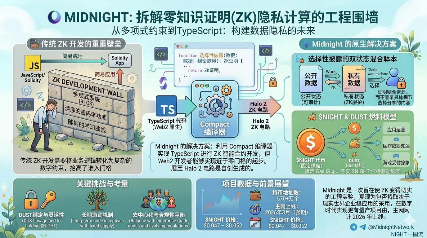 真实场景还是挺值得期待的,比如隐藏订单簿防MEV、隐私抵押贷款保护资产细节、基因匹配只上链匹配结果、匿名投票等等。这些都能在保护隐私的同时,保持可验证性。说下数据吧,目前 $NIGHT 价格在0.047–0.052美元之间波动,市值大概8.5亿美元,持币地址超过5.7万。链上数据看,流通筹码还挺集中的,前几个大地址占比比较明显,这在早期项目里也算正常。最近跟着宏观市场调整,价格有些波动,衍生品市场的资金费率和持仓变化也值得留意。我觉得Midnight的价值不在短期炒作,而是它能不能真正把ZK开发门槛降下来,让更多开发者进来做务实的应用。主网预计2026年3月底上线,到时候DUST的实际消耗率、企业级DApp的活跃度、主网稳定性这些数据,会是检验生态健康度的关键指标。加密世界里,技术创新永远跟挑战绑在一起。Midnight给我的感觉更像一场认真的工程实验,用TypeScript的外壳包装深奥的密码学,试图在隐私和合规之间找到一个平衡点。如果它能搞定工程和节奏上的难题,也许真的能为Web3带来一种更有尊严的隐私空间,不是为了藏着掖着,而是为了让人们在数字时代还能保留一点不受监视的自由。(本文是平台任务,不构成任何投资建议。)