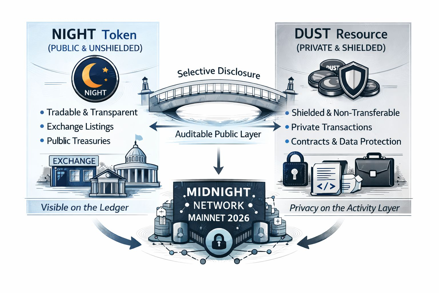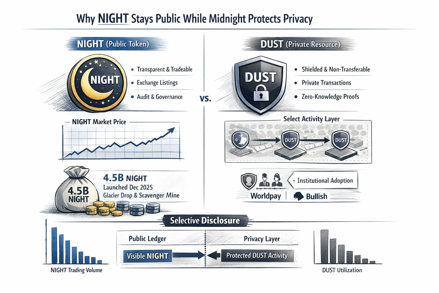 What I find most interesting is that Midnight is not trying to make every part of blockchain invisible. It is doing something more selective. NIGHT is the public and unshielded native token. DUST is the private network resource created by holding NIGHT. Midnight’s own material presents NIGHT as transparent and better suited to exchange listings, public treasuries, and other settings where auditability matters. DUST works differently. It is shielded, non transferable, renewable, and used to power transactions on the network. That split is really the core of the model.