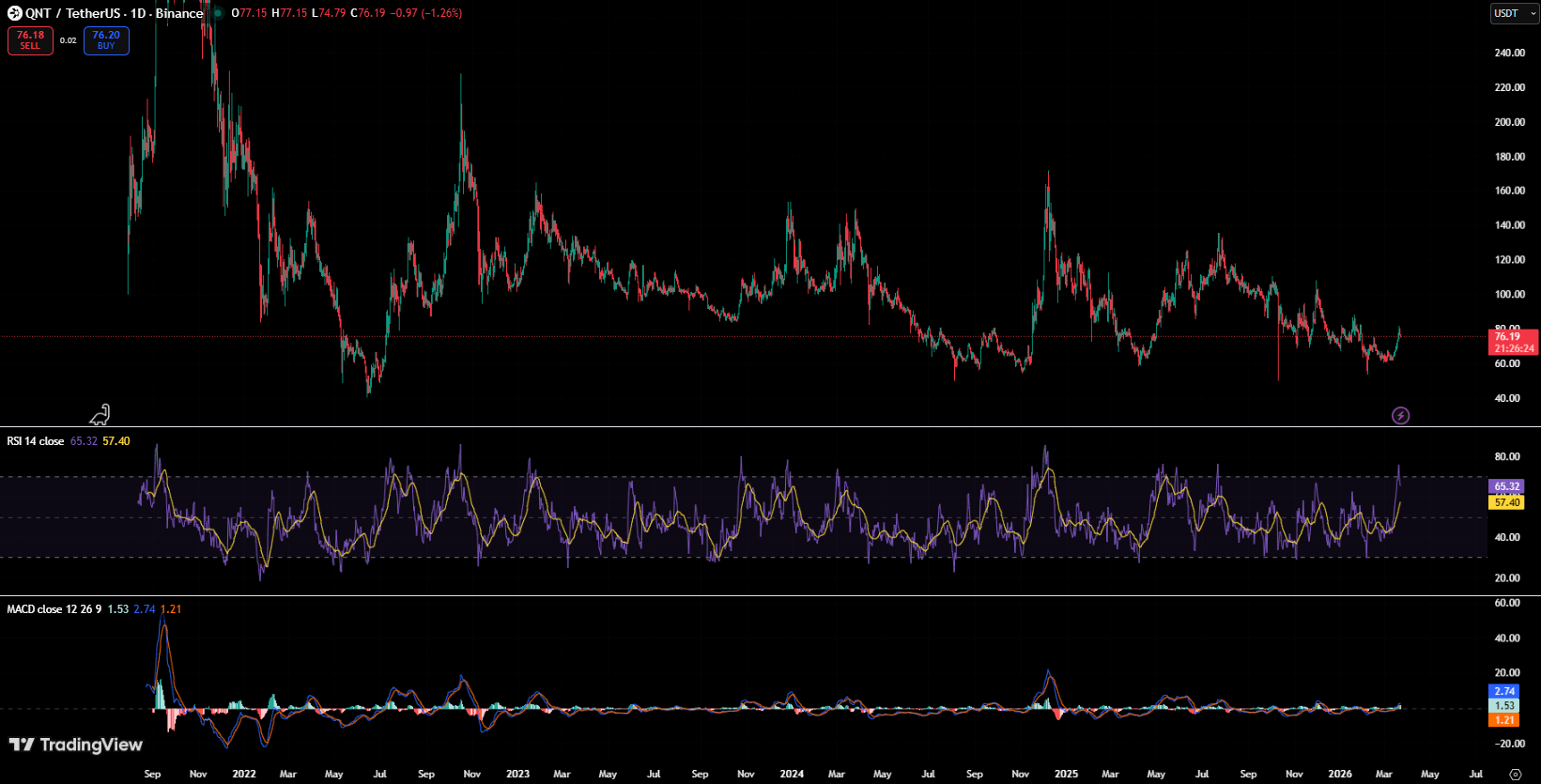 On the charts, RSI sits at 65 with the signal line around 57 - elevated but not yet overbought, leaving some room before momentum stalls. MACD is positive and expanding, confirming real buying rather than thin-volume noise. That said, QNT remains well off its 2021 highs and still in a long-term downtrend that's only recently flattened. The Robinhood pop is real; sustaining anything above $85 consistently would be the first structural test worth watching.