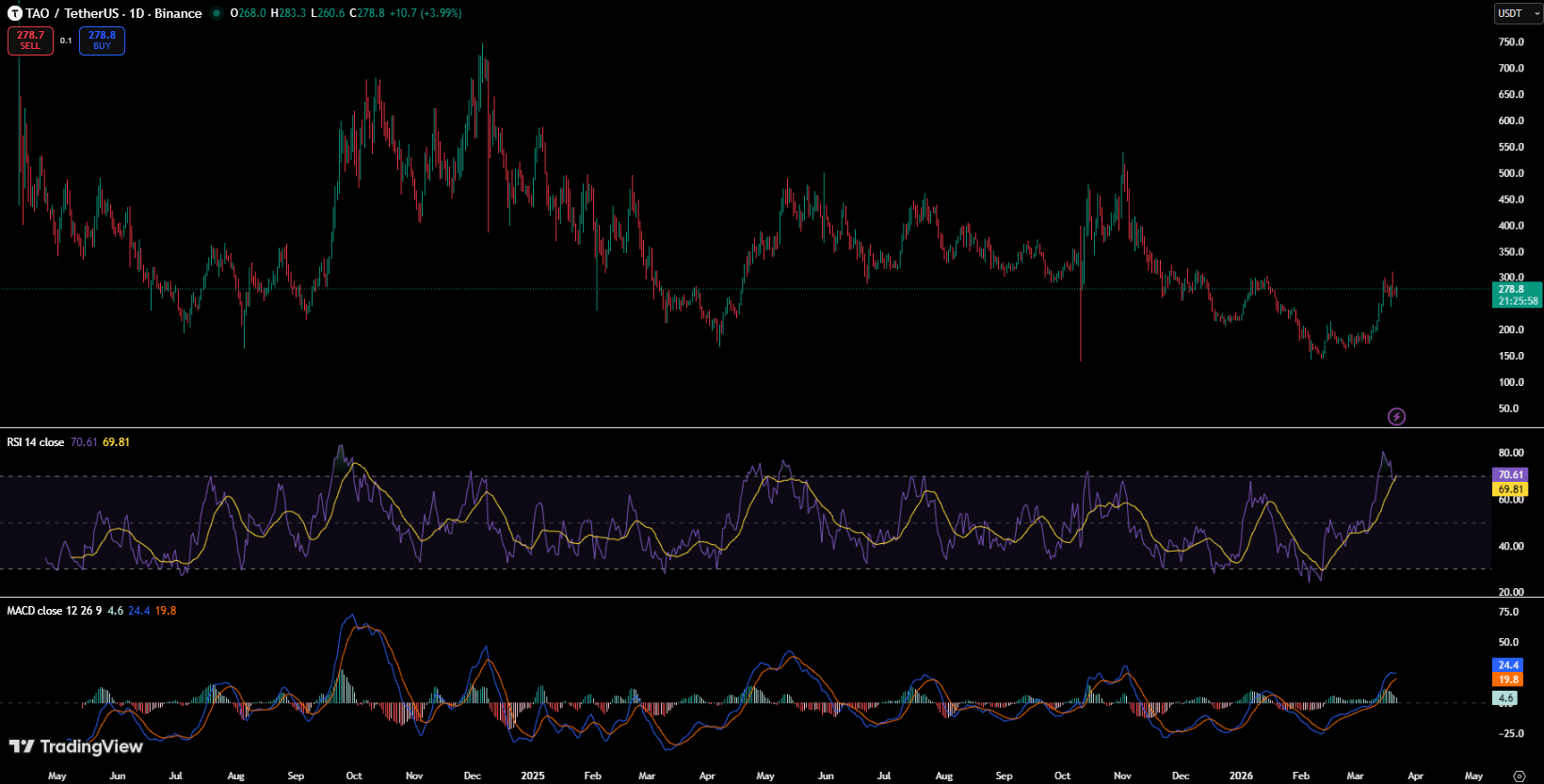TAO surged following a Jensen Huang mention - trading at $281 with RSI pushing overbought