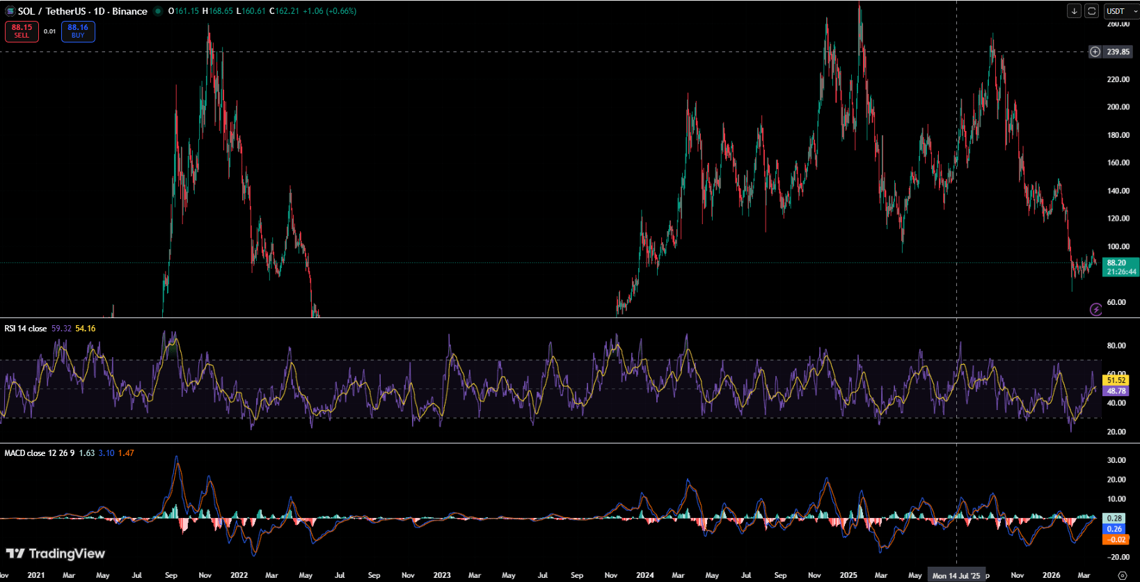 Solana came in fourth for mixed reasons. SOL is at $88.20, number 7 by market cap at $50.5 billion, with the daily chart still leaking lower. RSI is hovering around 51-54 but trending down from higher readings earlier this year - fading momentum, not stabilization. MACD is barely positive with a shrinking histogram. SOL put in a major top above $220 in early 2025 and has been in a clear downtrend since, now trading below the 200-day moving average. The $80-85 zone is near-term support; losing it puts $60 back in the conversation.