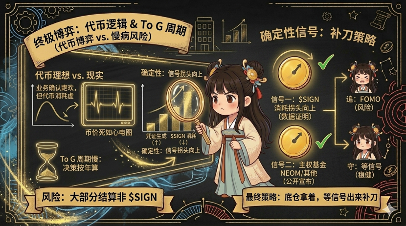 我现在的仓位策略说出来你们别笑:底仓拿着,不追不割,但预留了一半的现金等着。我在等两个信号。第一个是链上凭证生成量和SIGN代币消耗量的比值开始明显拐头向上。第二个是NEOM或者任何一个能叫得上名字的主权基金,公开宣布正式采用SIGN的解决方案。这两个信号只要出现一个,我会把剩下的仓位打进去。如果两个都没出现,我就继续等。