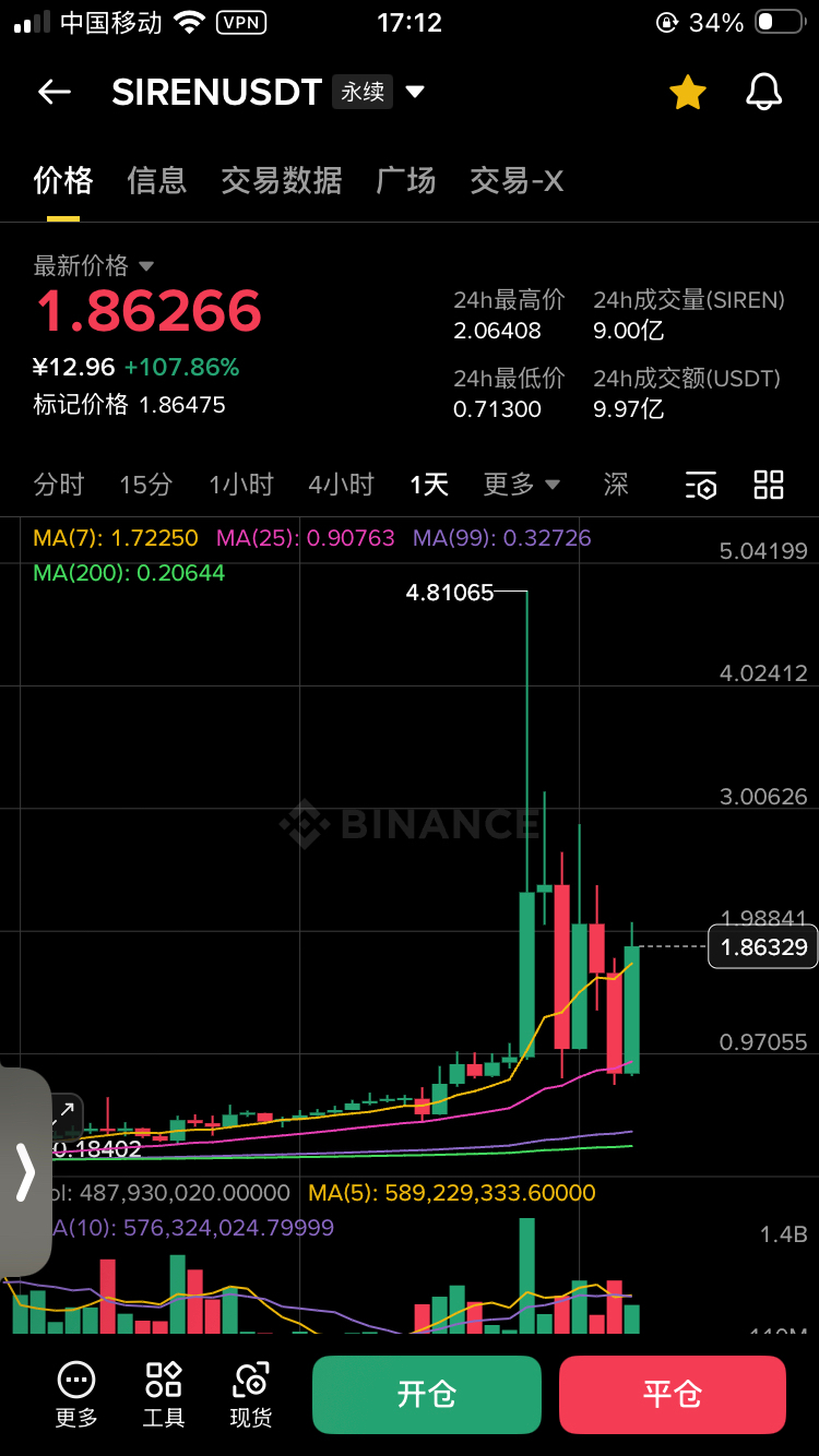 • 对应盘面特征:SIREN从4.81 USDT的高点,直接砸到0.713 USDT的24h低点,单日最大跌幅超85%,随后又暴力拉升到2.06 USDT,24h涨幅超107%,完美复刻了LYN高位第一次暴跌后的反弹走势。