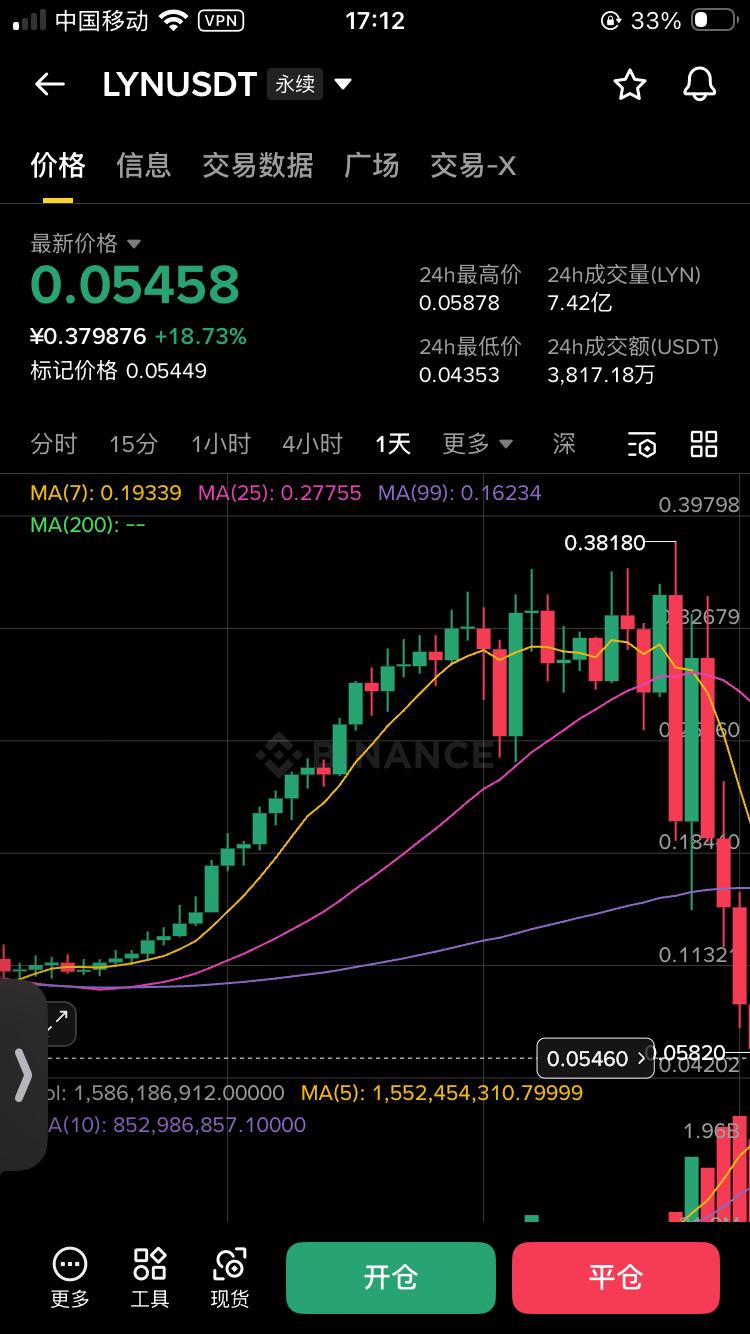 • 对应盘面特征:LYN从0.18 USDT直接断崖式下跌,最低跌到0.04353 USDT,没有任何像样的反弹,因为庄家已经不需要再用反弹培养抄底情绪了,手里已经没有筹码需要卖出了。