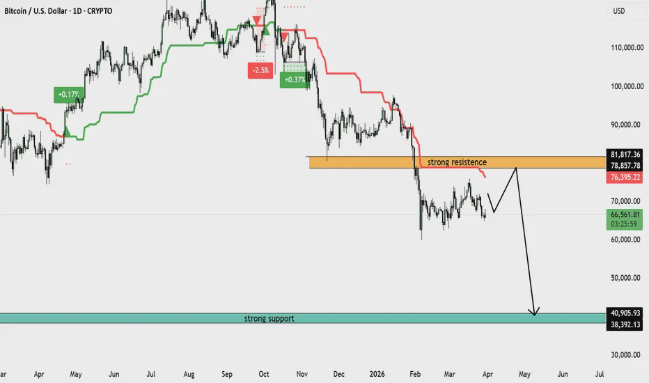 Bitcoin ($BTC USD) handluje obecnie w wyraźnej struktury spadkowej po silnym odrzuceniu z poziomu oporu 78,800 – 81,800, który teraz stał się kluczowym obszarem podaży. Rynek nie zdołał odzyskać tego poziomu, potwierdzając dominację sprzedawców i kontynuację trendu spadkowego.