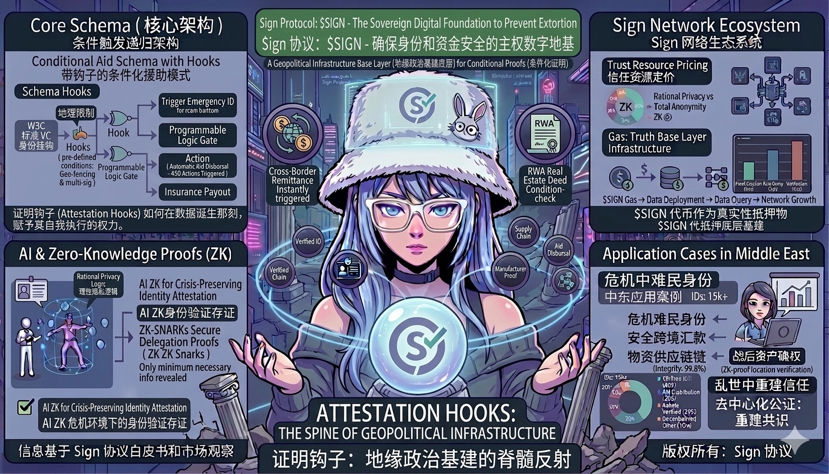 W takim środowisku jak Bliski Wschód, ludzie potrzebują nie ulotnej „decentralizacji”, ale „twardej logiki”, która nawet w obliczu nieefektywności systemu biurokratycznego i upadku porządku społecznego nadal może chronić ich majątek i tożsamość. Mechanizm Hooks w Sign w rzeczywistości przekazuje władzę z rąk ludzi do matematyki i predefiniowanego kodu.