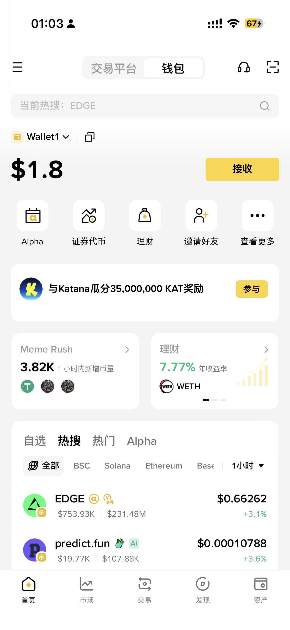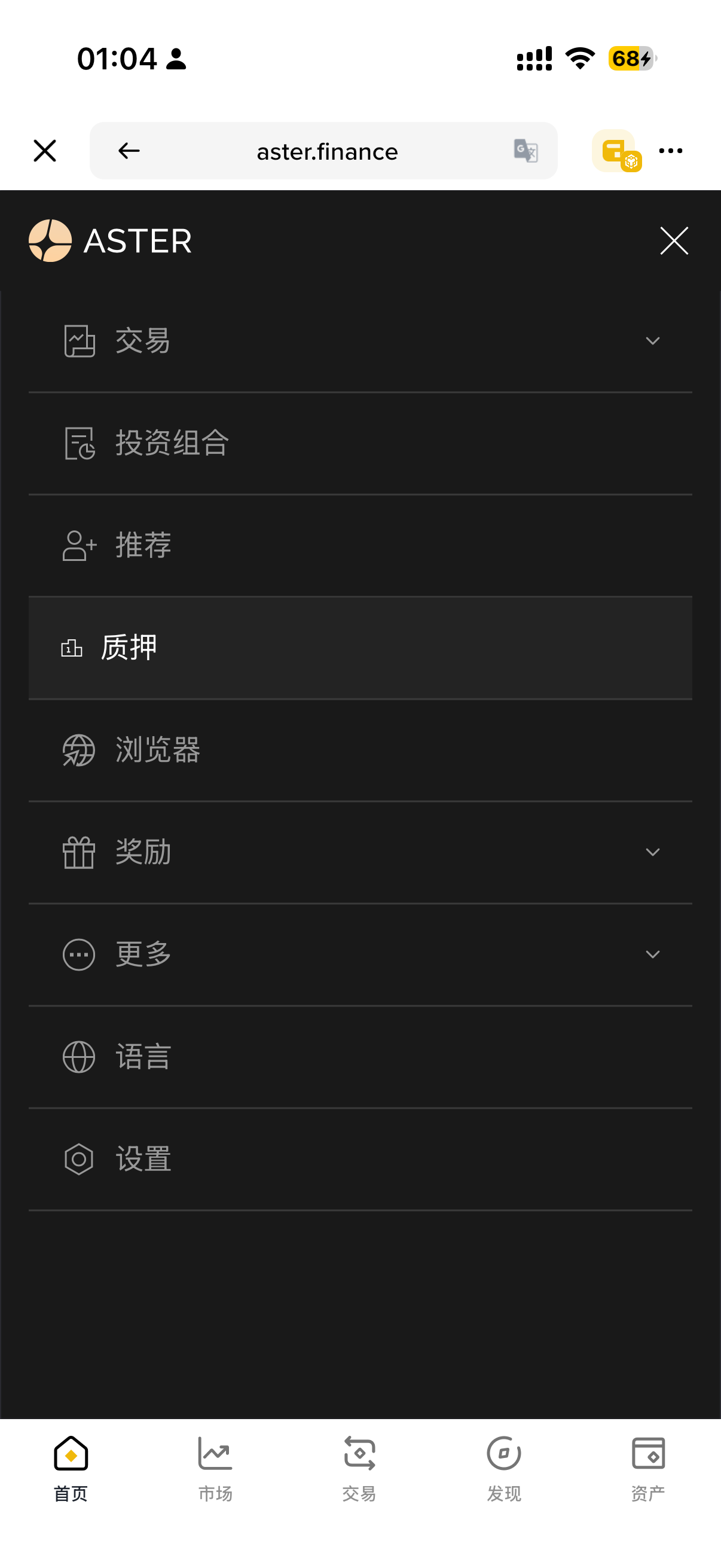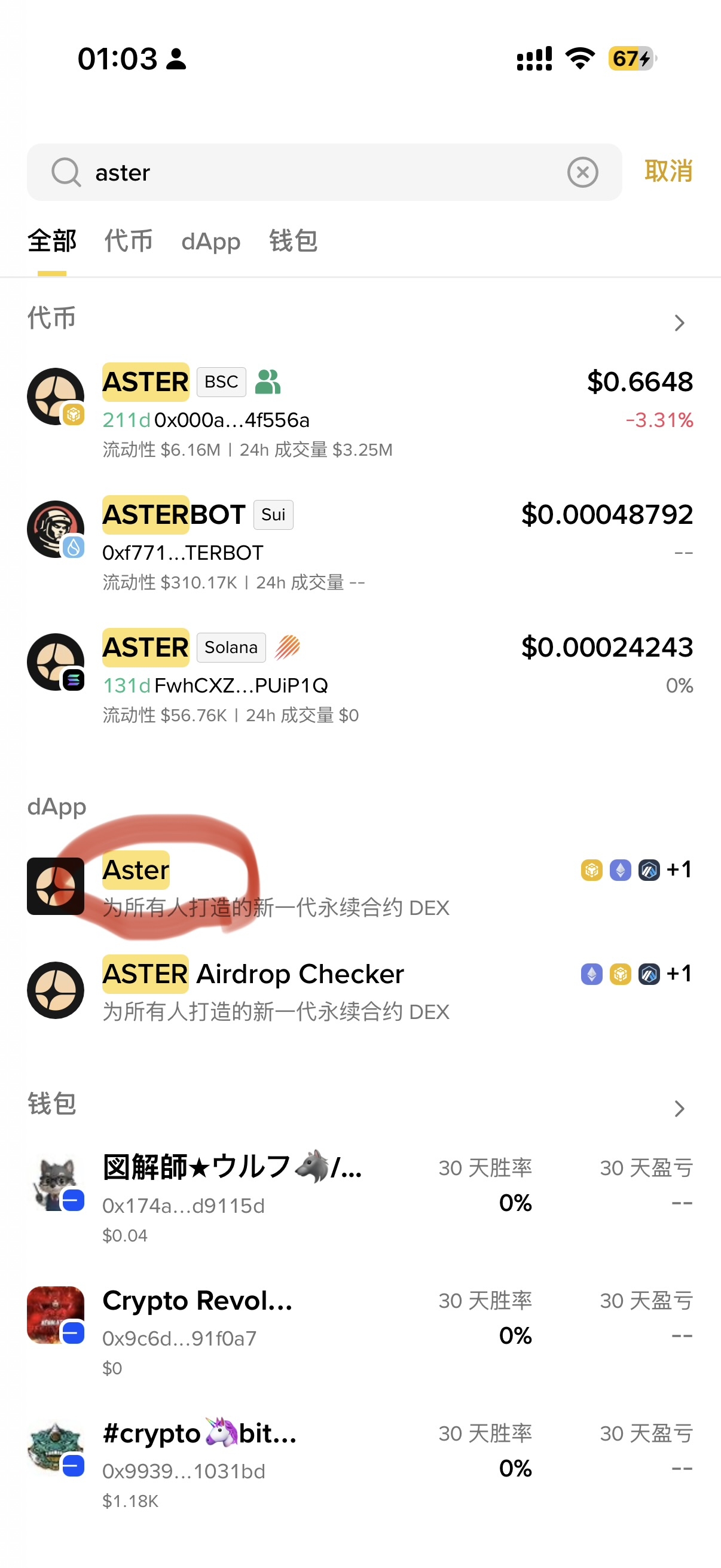 W polu wyszukiwania portfela Binance wpisz aster, w Dapp znajdź „aster”, to jest giełda Aster zintegrowana z portfelem Binance.