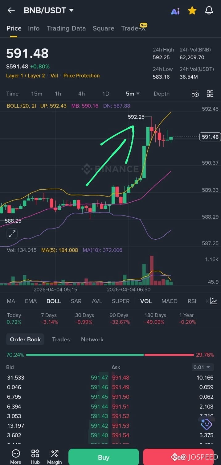 So right now at $591, BNB is down roughly 57% from its ATH — still in a deep correction phase from the bull run peak.
