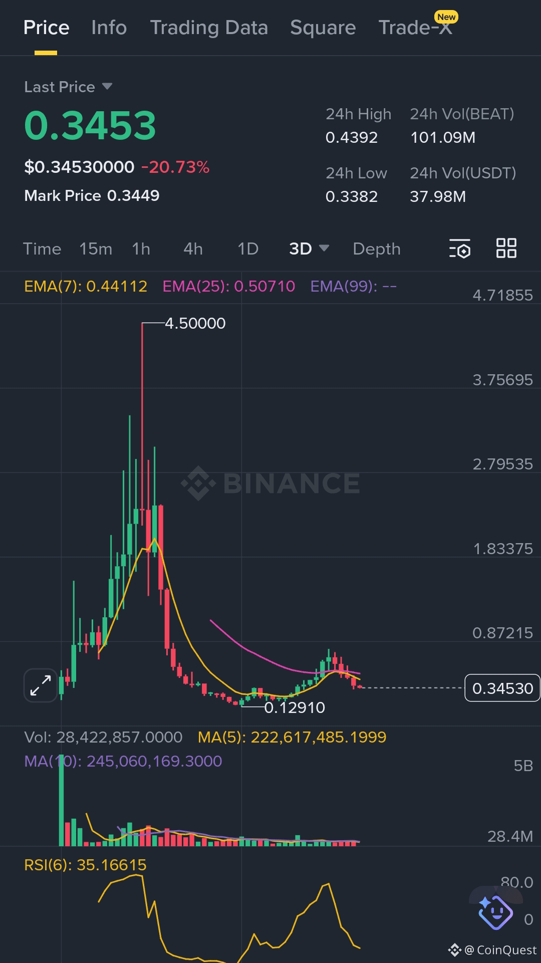 BEAT once delivered an explosive move, rallying from around $0.129 to a peak near $4.50. However, what followed is a clear and sustained downtrend. At the time of writing, price is hovering around $0.345, with no convincing signs of a reversal yet.
