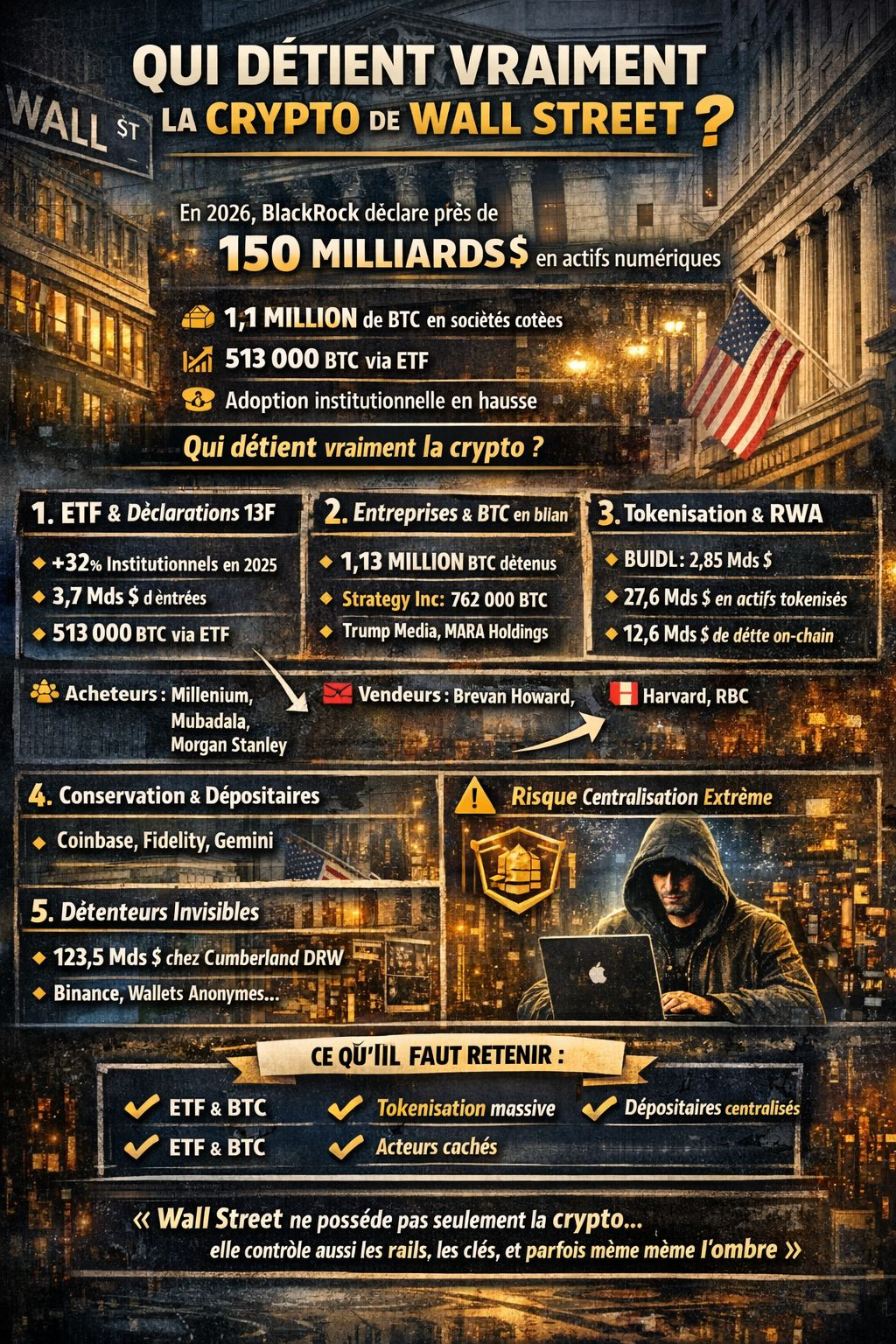 L’empreinte de Wall Street dans la crypto n’a jamais été aussi importante. BlackRock a, à elle seule, déclaré près de 150 milliards de dollars d’actifs numériques sous gestion dans la lettre de son président pour 2026. Les sociétés cotées détiennent plus de 1,1 million de BTC dans leur bilan. Les institutions affichent plus de 513 000 BTC au travers des ETF.