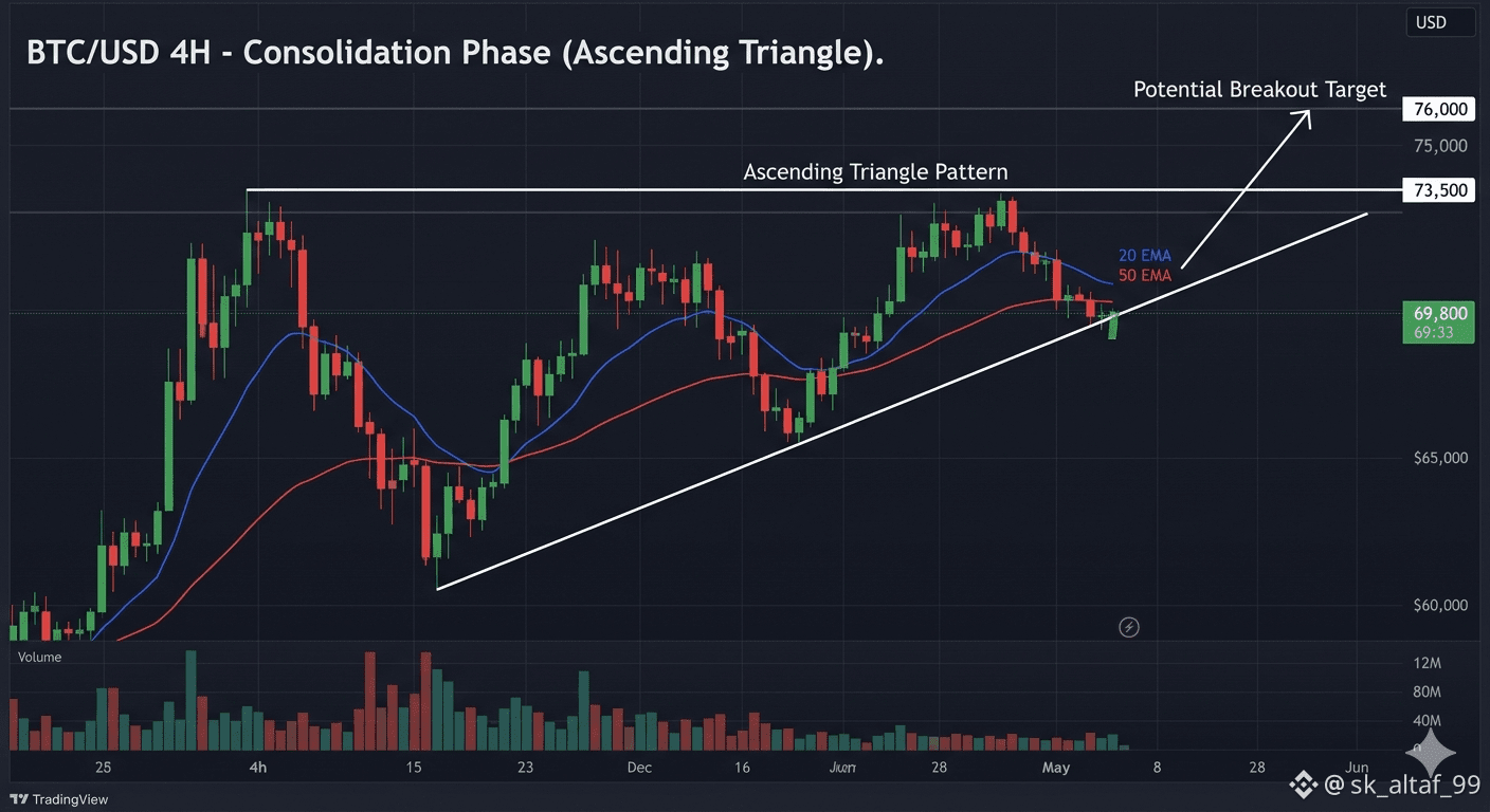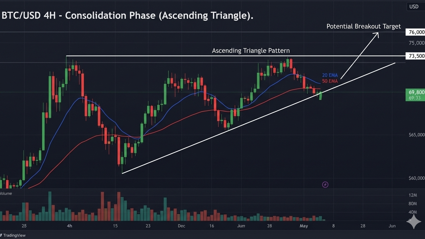 Bullish Scenario: A decisive, high-volume break above $73,500 confirms the triangle pattern. This would likely trigger a rapid move toward the measured target near $76,000, potentially leading to new all-time highs.