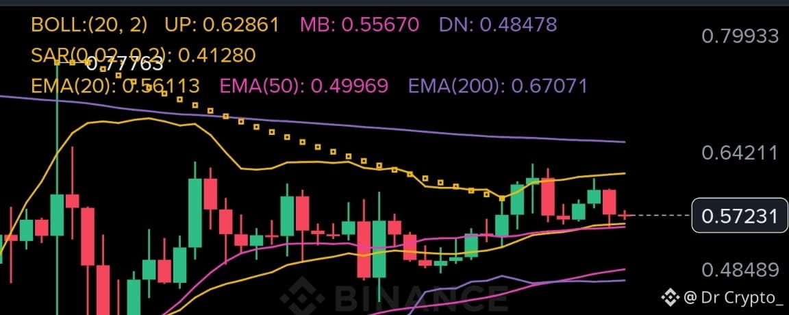 Codziennie na 0.571 jest głęboko w trendzie spadkowym od szczytu 4.81, przy czym cena wciąż jest znacznie poniżej EMA20 na 0.817 i EMA50 na 0.700, SAR zablokowany powyżej na 2.10, a StochRSI na 13 dopiero zaczyna się wyginać bez żadnej strukturalnej potwierdzenia odwrócenia. H4 silnie odbił się od niskiego poziomu 0.130, a SAR zmienił się w byczy na 0.493, co nadaje odbiciu legitymację, jednak StochRSI jest już przyklejony na 93, a OBV spłaszcza się, co oznacza, że ruch odbicia działa na oparach na obecnych poziomach. H1 SAR już zmienił się powyżej ceny na 0.777, a StochRSI na 43 jest w średnim zakresie spadającym, wskazując na niewielki ruch w stronę strefy 0.580 do 0.628, gdzie górna banda BOLL H1 i środkowa banda BOLL H4 zbiegają się przed ponownym atakiem sprzedawców. Główne ryzyko to rosnący OBV H4, a jeśli szersze oferty rynkowe wkroczą, może to ścisnąć w stronę codziennego EMA50 na 0.700, zanim krótka pozycja stanie się czysta.