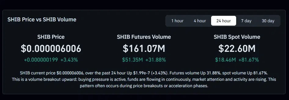 Rozbicie wolumenu pokazuje, że wolumen kontraktów terminowych Shiba Inu wzrósł o 31,8% do 161,07 miliona dolarów, dodając 51,35 miliona dolarów w ciągu ostatniego dnia. Zakupy wynoszą 50,81%, a sprzedaże 49,19%, co sugeruje, że wolumen kontraktów terminowych jest skierowany w stronę dalszego wzrostu cen.