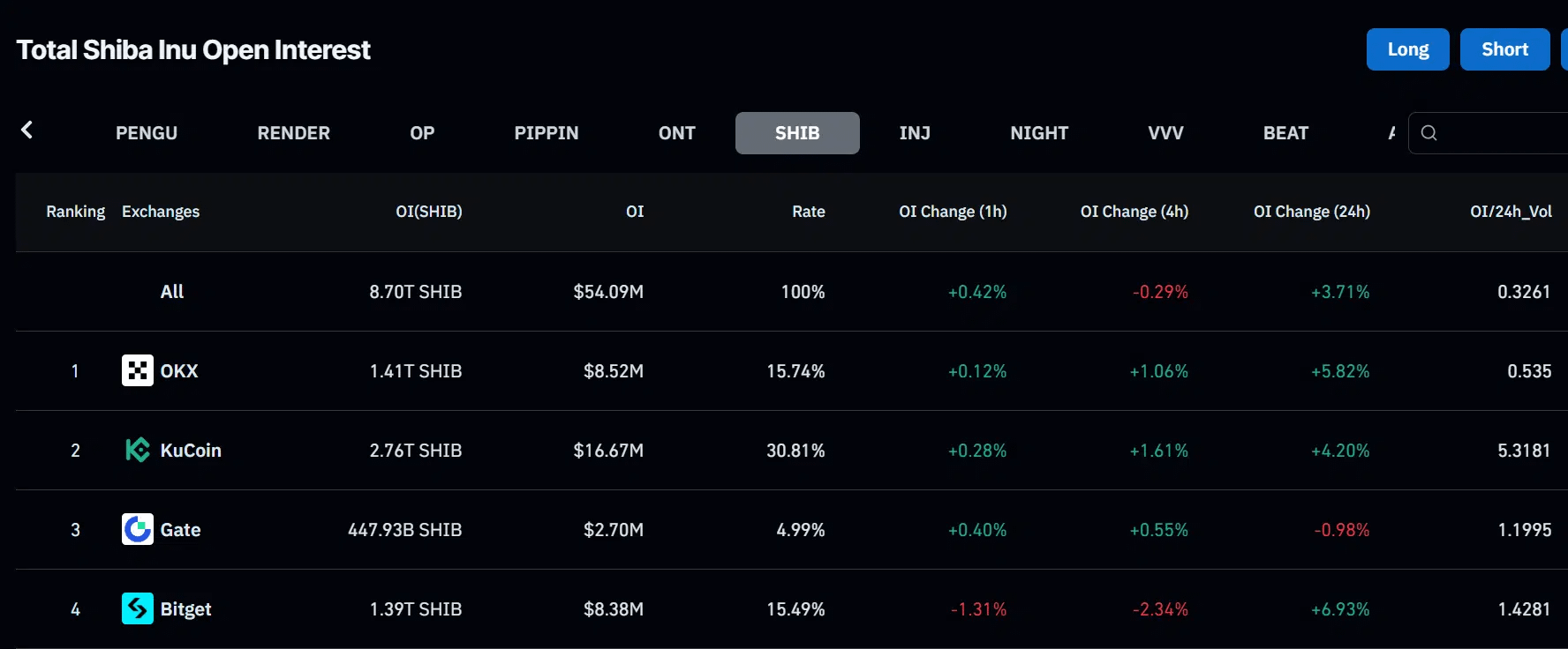 Dane z Coinglass pokazują, że otwarte zainteresowanie Shiba Inu (OI) wzrosło o 3,7% w ciągu ostatnich 24 godzin do 8,7 biliona SHIB. Wartość w dolarach wynosi 53,86 miliona dolarów.