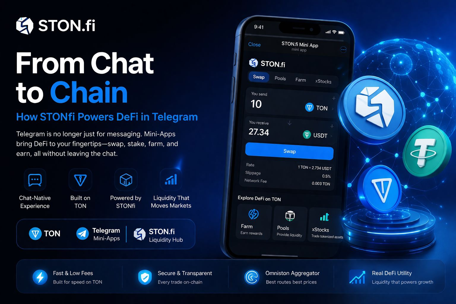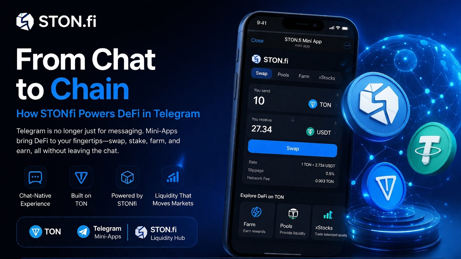 W centrum tej zmiany znajduje się STON.fi, wiodący DEX i hub płynności TON. Odgrywa kluczową rolę w przekształceniu Telegramu z platformy komunikacyjnej w funkcjonalne środowisko DeFi. Dzięki wspieraniu wymian, przepływów płynności, farmingu i routingu tokenów wewnątrz Mini-Apps, STON.fi sprawia, że działania on-chain stają się natychmiastowe, znajome i dostępne.
