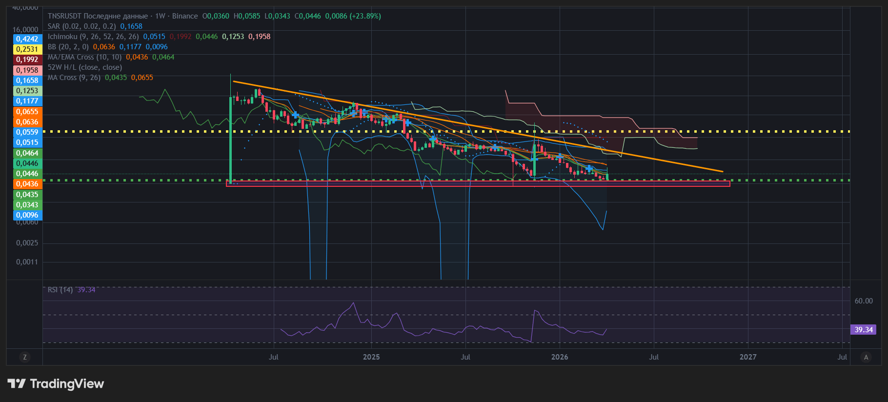 Patrzę na tygodniowy wykres TNSR/USDT i widzę obraz, który zaniepokoi każdego longista. Aktywo znajduje się w długoterminowym spadku, a obecna sytuacja przypomina próbę złapania spadającego noża.