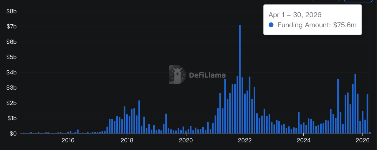 Dane DefiLlama ujawniają, że startupy kryptowalutowe zebrały 76 milionów dolarów w pierwszym tygodniu drugiego kwartału 2026 roku. Według Odaily, całkowite finansowanie w tym roku zbliża się do 500 milionów dolarów. Kluczowe rundy finansowania w tym tygodniu obejmują: