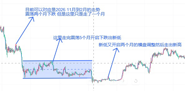 周末把大饼上一轮牛市走势分析了一下,大概说一下,上一轮牛市是在2021年11.10号这里出了新高,然后在2022年11.9号这里新低,从时间线来看,大饼走了一年出了底部,现在刻舟求剑上来看对应大饼时间上来看新低应该在2026年10.6号这里左右是底部,然后我这里做了一张上一轮熊市图片,走势跟这一轮熊市时间上是有所不同的,上一轮牛市跌的并没有这轮牛市快,所以走的也不会一样,震荡的时间也会更长,第一根箭头一个月这里就下跌出一个区间,第二根箭头,这里区间震荡了5个月才走出真正底部,第三根箭头这里新低走了两个月,我真正想说的是,按照4年周期走势来看,底部是在今10.6号,目前差不多还有6个月,目前大饼是在6万到7万6这里震荡了2个多月了,刚刚也说了,这轮牛市跌的比上轮快,所以熊市的震荡时间会更长,那按照这样来看,现阶段的震荡会更长,这个月如果没有出现特别的跌幅,那可以来说这里是一个更长的区间震荡,这个有待观察。然后就是震荡6个月至10月份出底部。