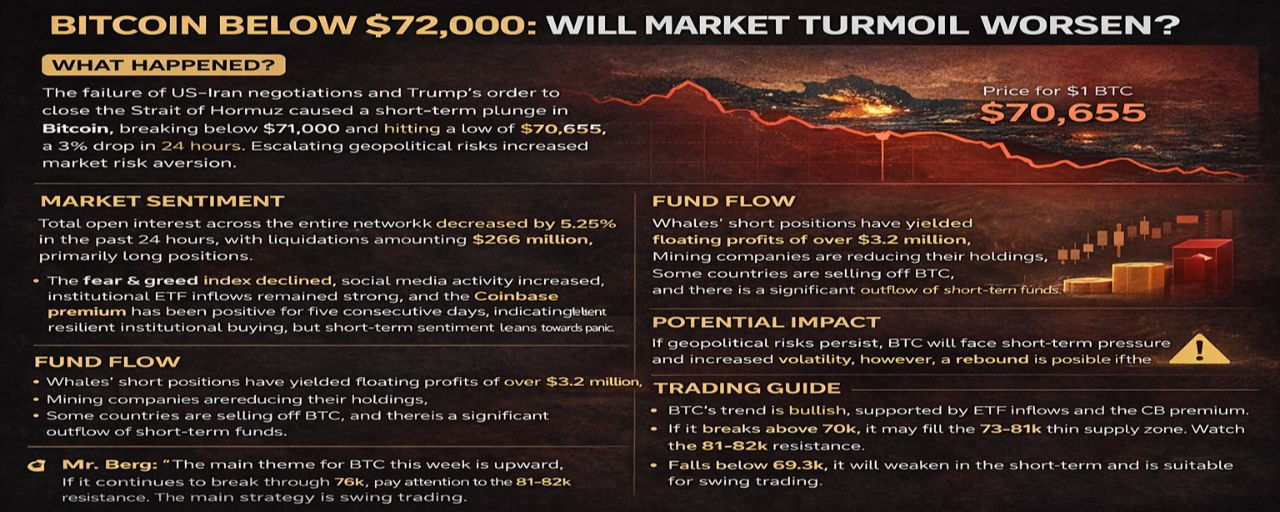 The failure of US-Iran negotiations and Trump's order to close the Strait of Hormuz caused a short-term plunge in Bitcoin, breaking below $71,000 and hitting a low of $70,655, a 3% drop in 24 hours. Escalating geopolitical risks increased market risk aversion.