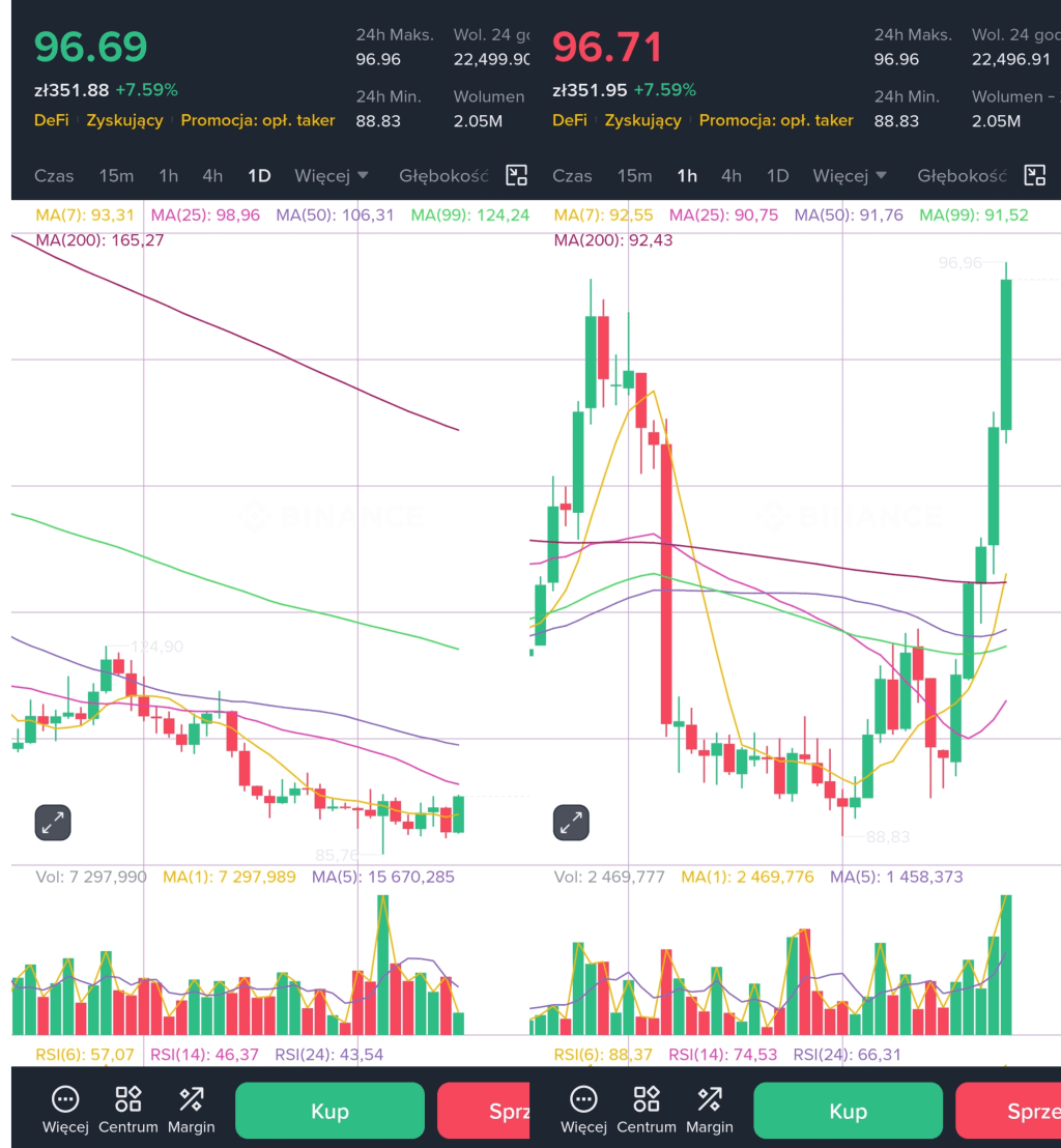 Wykres D1 pary AAVE/USDC pokazuje dynamiczne odbicie od lokalnego dołka (~88 USD), co potwierdza silną strefę popytu w tym rejonie. Cena przebiła kluczową, krótkoterminową średnią kroczącą MA(7), co technicznie faworyzuje byki w najbliższym terminie. Jednak szerszy obraz pozostaje w trendzie spadkowym, definiowanym przez nachylenie MA(200) i MA(99).