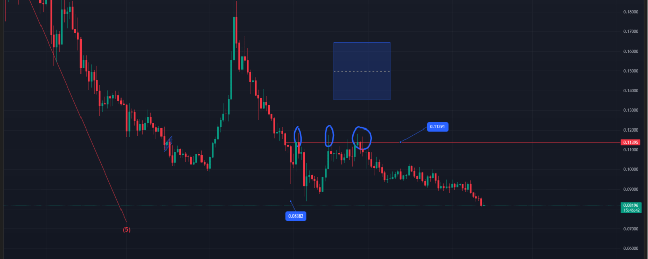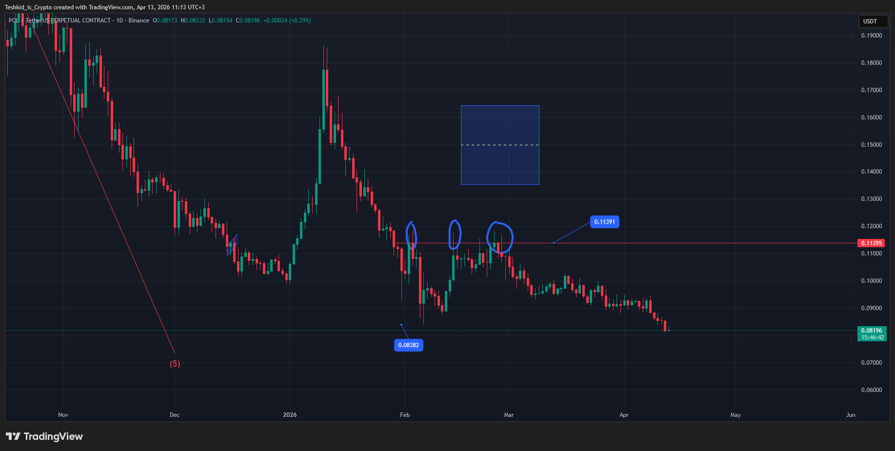 $POL łamie się po odrzuceniu w kluczowym obszarze oporu przy $0.11391. Teraz łamiemy się do nowych dołków po złamaniu dołka, który osiągnęliśmy przy $0.08383.