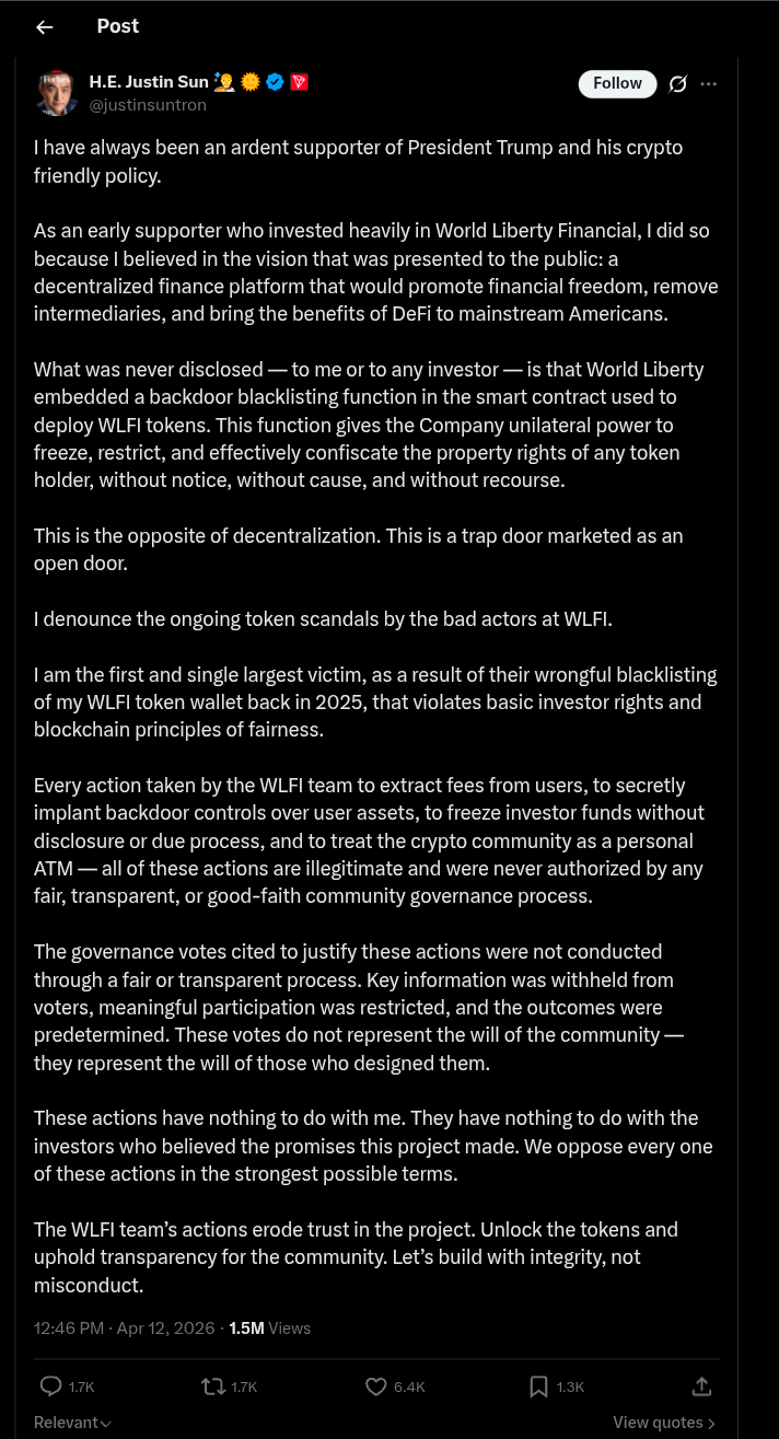 > WLFI team responded and threaten Justin Sun that see you in the court because he was dumping theur coins.