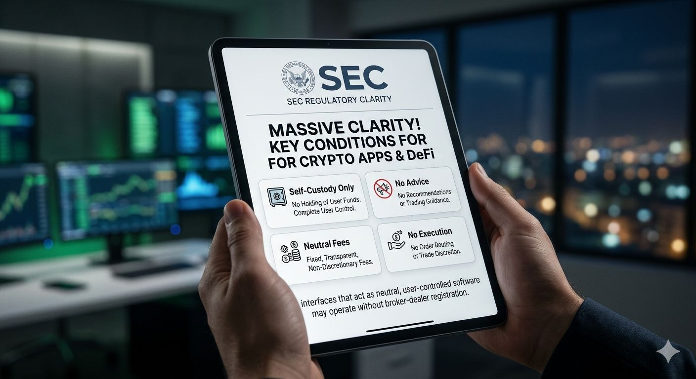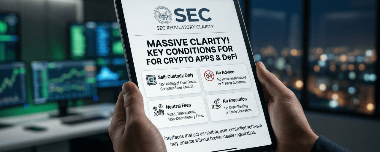 Ogromne wieści dla przestrzeni DeFi i portfeli kryptograficznych! SEC właśnie wyjaśnił konkretne warunki, na podstawie których niektóre interfejsy kryptograficzne — w tym front-endy DeFi, rozszerzenia portfeli i aplikacje — NIE muszą rejestrować się jako brokerzy-dealerzy. To jest ważny rozwój dla platform samodzielnego przechowywania i programistów oprogramowania w ekosystemie Web - 3.