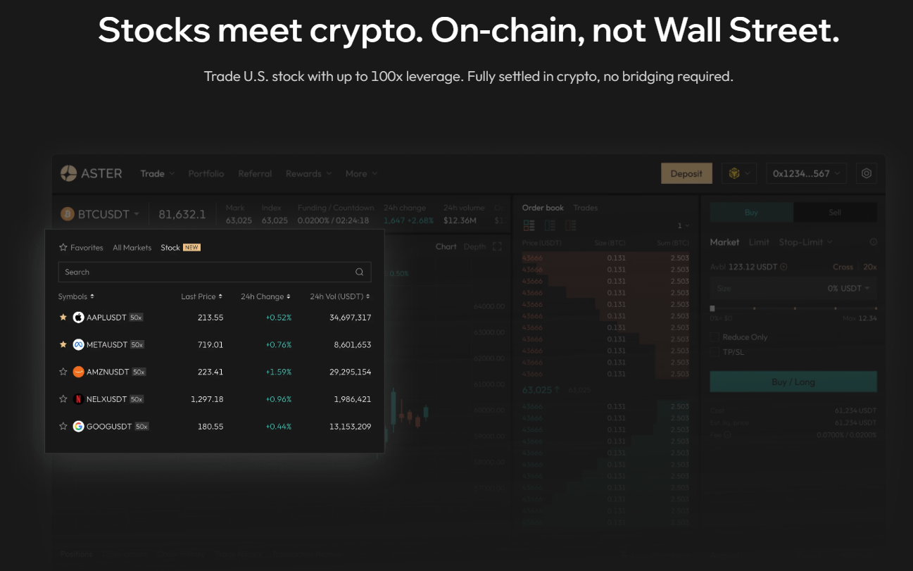 Aster pozwala użytkownikom handlować kontraktami terminowymi na akcje USA z dźwignią do 100x, w pełni rozliczanymi w kryptowalutach, bez konieczności korzystania z mostów.