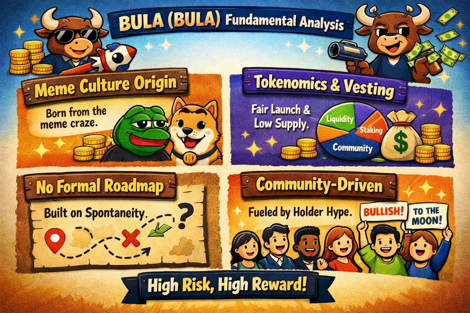 * $BULLA is explicitly marketed as a **meme fuel and cultural token** – something meant to be fun, viral, and community-driven. Its official website describes it as existing for entertainment and hype purposes and even states “no roadmap, no promises.” ([bullamascot.io][1])