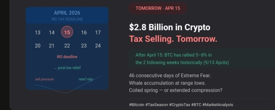So what's the actual setup? Tax selling is a known, temporary headwind. The moment it lifts on April 16, the market loses one of the more mechanical reasons people have been selling. If the Iran talks on April 15 also produce any positive signal — even a partial deal — you could see a fast move higher. There's $6 billion in short positions stacked between $72,200 and $73,500 waiting to be squeezed.If you're holding long-term, you probably already know what to do: nothing. Tax season selling is noise. If you've been waiting for an entry point, the next 48 hours might be one of the cleanest setups you'll see this month.Not financial advice. But the data is what it is.
