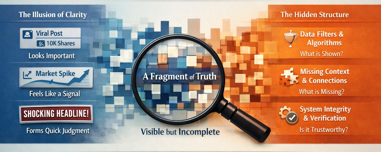 To, co pojawia się przed nami, wydaje się natychmiastowe, spójne i wiarygodne. Tworzy poczucie jasności, które rzadko budzi wątpliwości. Jednak ta jasność jest często konstruowana, a nie odkrywana. Nowoczesne środowisko cyfrowe nie przedstawia rzeczywistości w jej pełnej formie; przedstawia fragmenty—uzyskane, przefiltrowane i uporządkowane dla szybkości. Z czasem te fragmenty zaczynają wydawać się pełnymi reprezentacjami, nawet gdy nimi nie są.