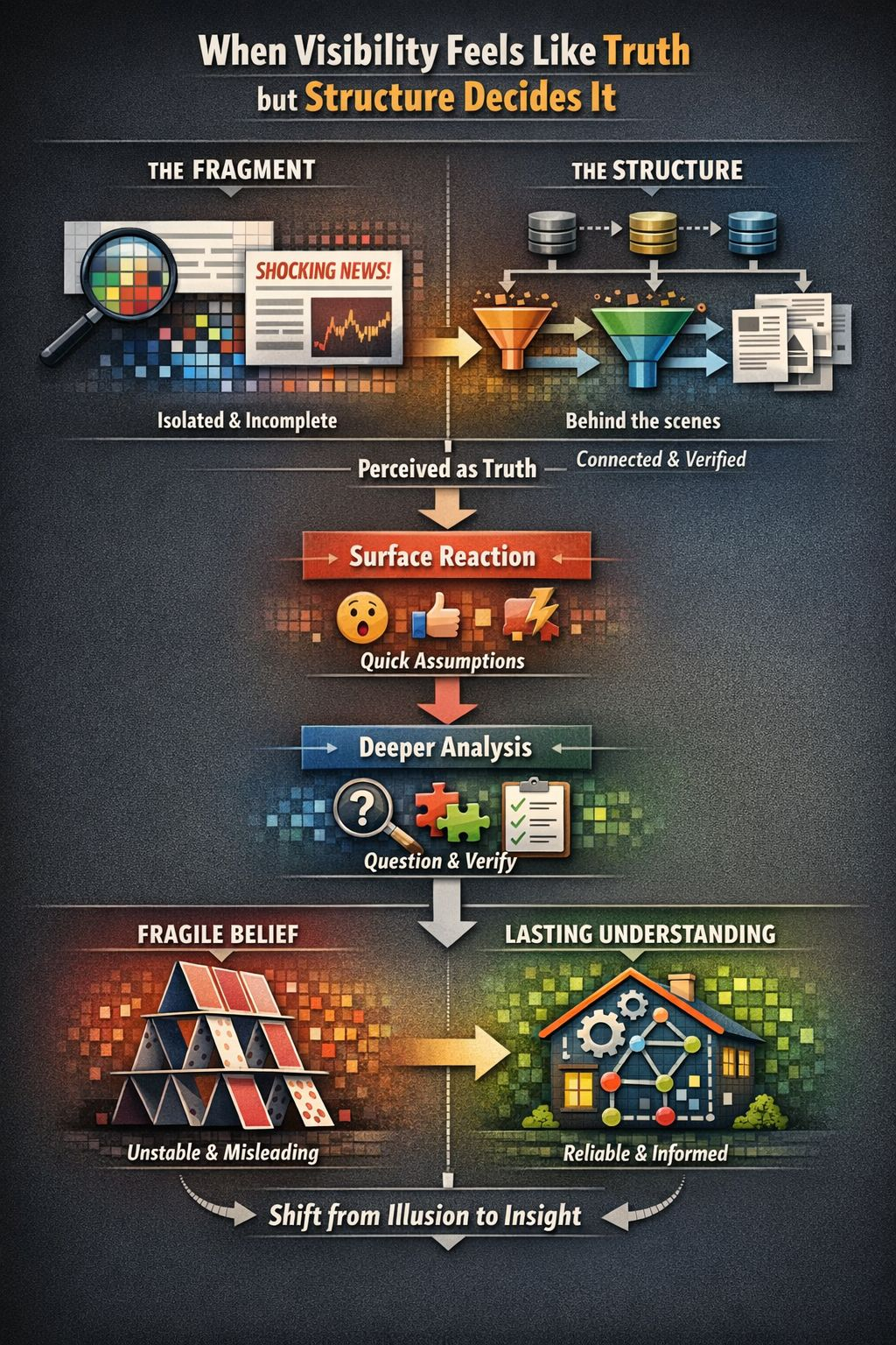 Konsekwencją polegania wyłącznie na fragmentach jest subtelna, ale potężna. Decyzje stają się reaktywne. Pewność staje się niestabilna. Każdy nowy kawałek informacji ma zdolność zmiany percepcji, ponieważ nie ma głębszej struktury, która by ją zakotwiczała. Z czasem tworzy to cykl, w którym jasność wydaje się stała, ale zrozumienie pozostaje płytkie.