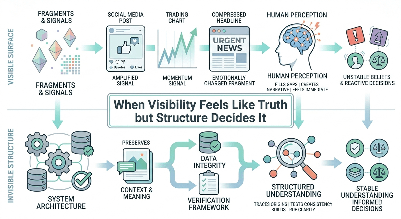 W takim systemie widoczność nie jest już ostateczną warstwą—jest tylko punktem wejścia. To, co się liczy, to nie to, co pojawia się na początku, ale to, co utrzymuje się konsekwentnie pod badaniem. Informacje nie są już akceptowane tylko dlatego, że są widoczne, ale dlatego, że można je śledzić, testować i rozumieć w ramach wiarygodnej struktury.