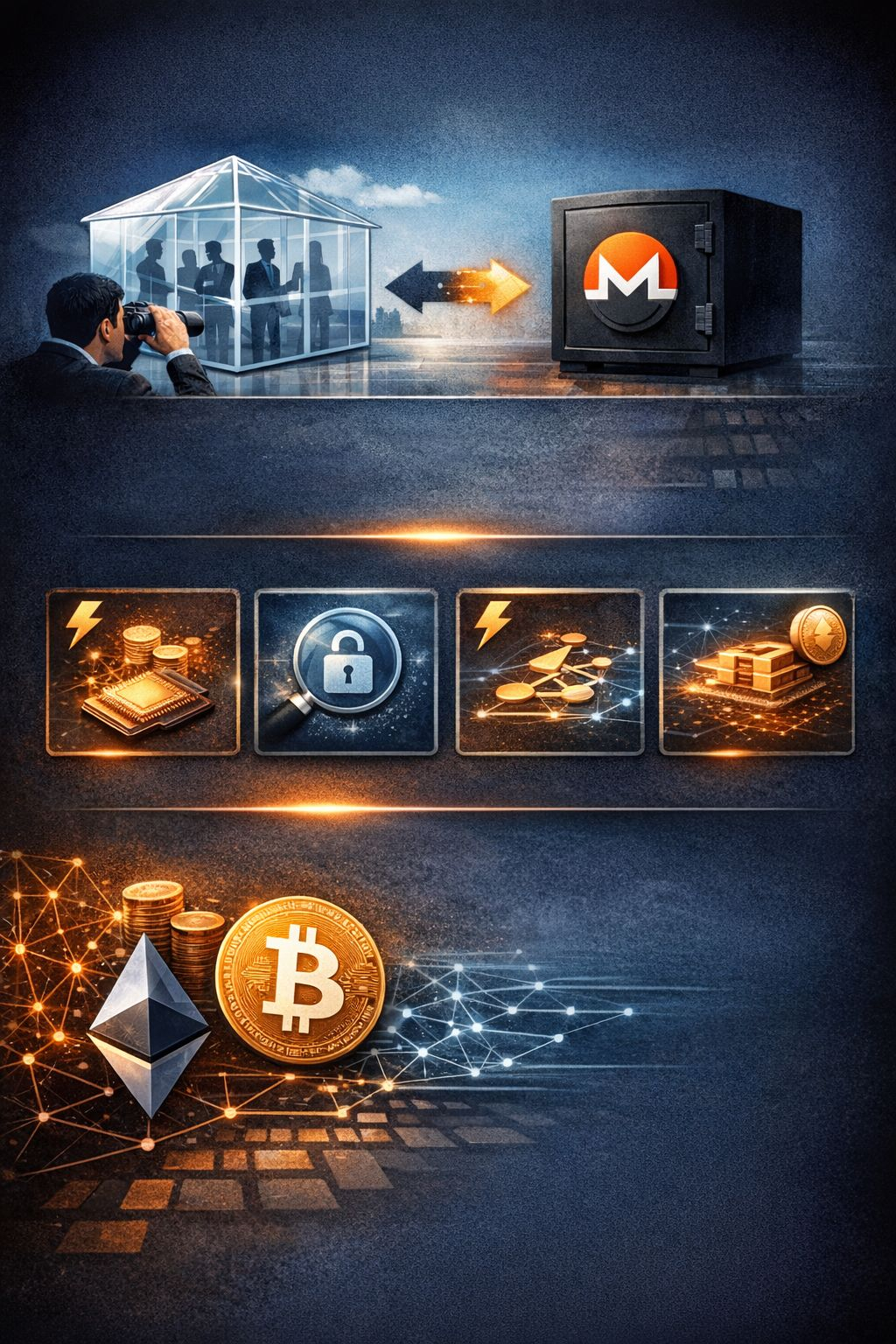 ⚡ إثباتات المعرفة الصفرية (ZKP): إثبات صحة المعاملة (مثل أن المرسل غير خاضع للعقوبات) دون كشف حجم الصفقة أو توقيتها للعامة.