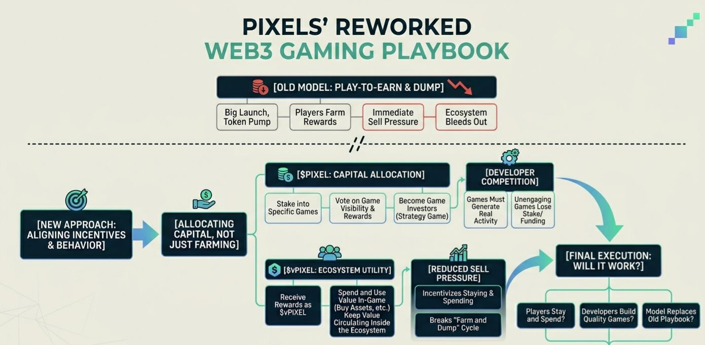 Przez przenoszenie nagród do tokena skoncentrowanego na wydatkach, Pixels stara się utrzymać wartość krążącą wewnątrz ekosystemu zamiast uciekać na zewnątrz.