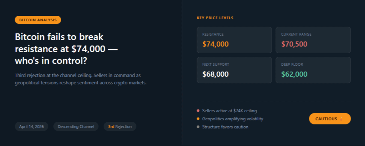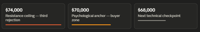 Bitcoin's rejection near $74,000 highlights a market still trading within a defined trend. Resistance remains firm, geopolitical tensions are shaping sentiment, and technical structure continues to favor caution over celebration. The $70,000 region keeps attracting buyers and attention in equal measure. A break below $68,000 opens the path toward $62,000 — and that's the scenario keeping short-term traders cautious.