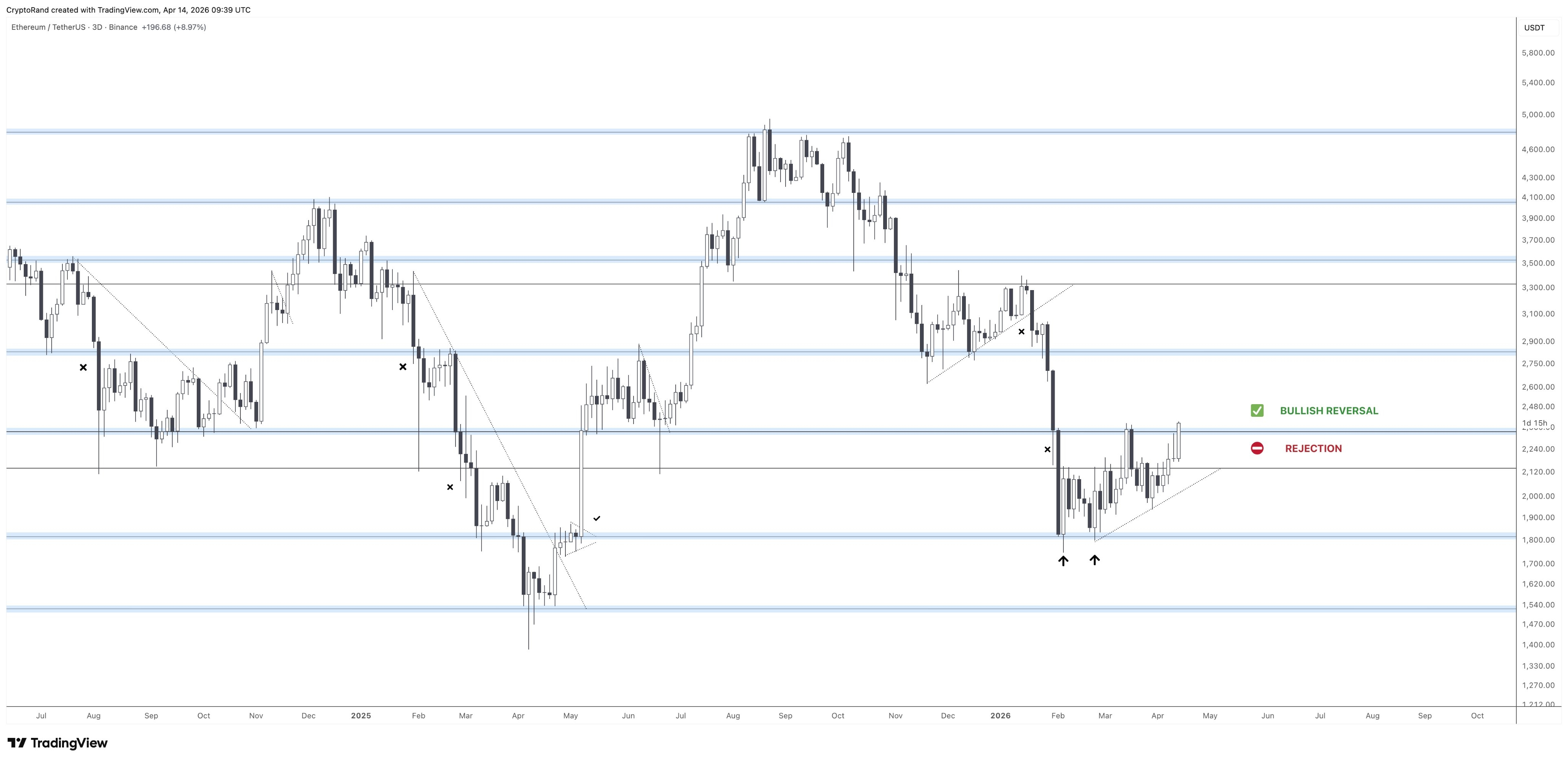 Jeśli historia się powtórzy, ETH może wzrosnąć o więcej niż 250% w kierunku 6 300 dolarów. Dalsza potwierdzenie odwrócenia trendu teraz zależy od tego, czy Ether „przekroczy kluczowy zakres 2 400 dolarów”, powiedział analityk Cryptorand, dodając: