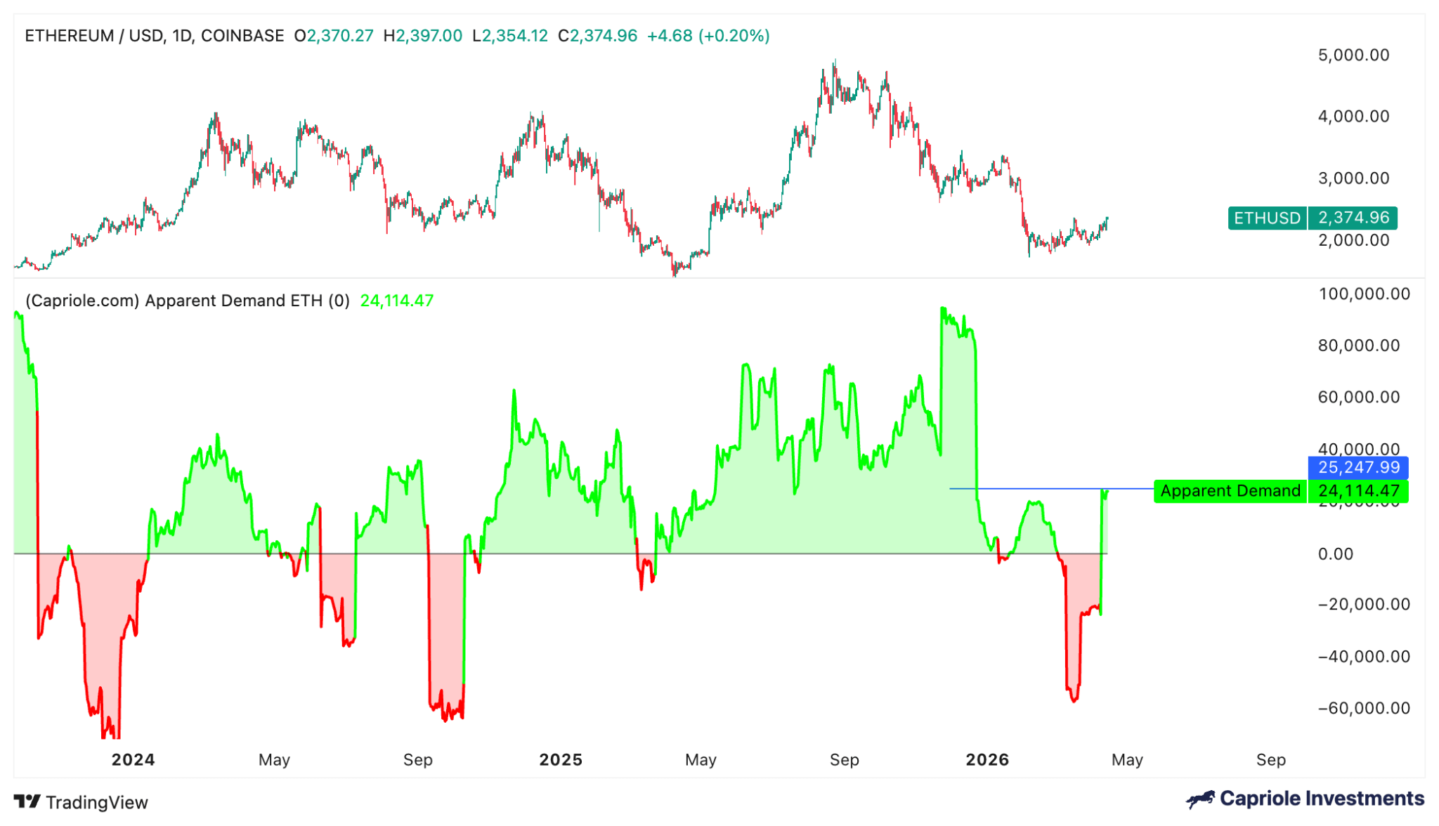 Wyraźny popyt na ETH. Źródło: Capriole Investments.